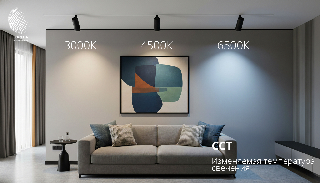 - Раньше надо было продумывать цветовую температуру и мощность, но самые современные трековые светильники (например, серия светильников Servus Smart) оснащены CCT диодами, у которых настраивается температура свечения от теплого до холодного свечения и яркость от 0 до 100%.