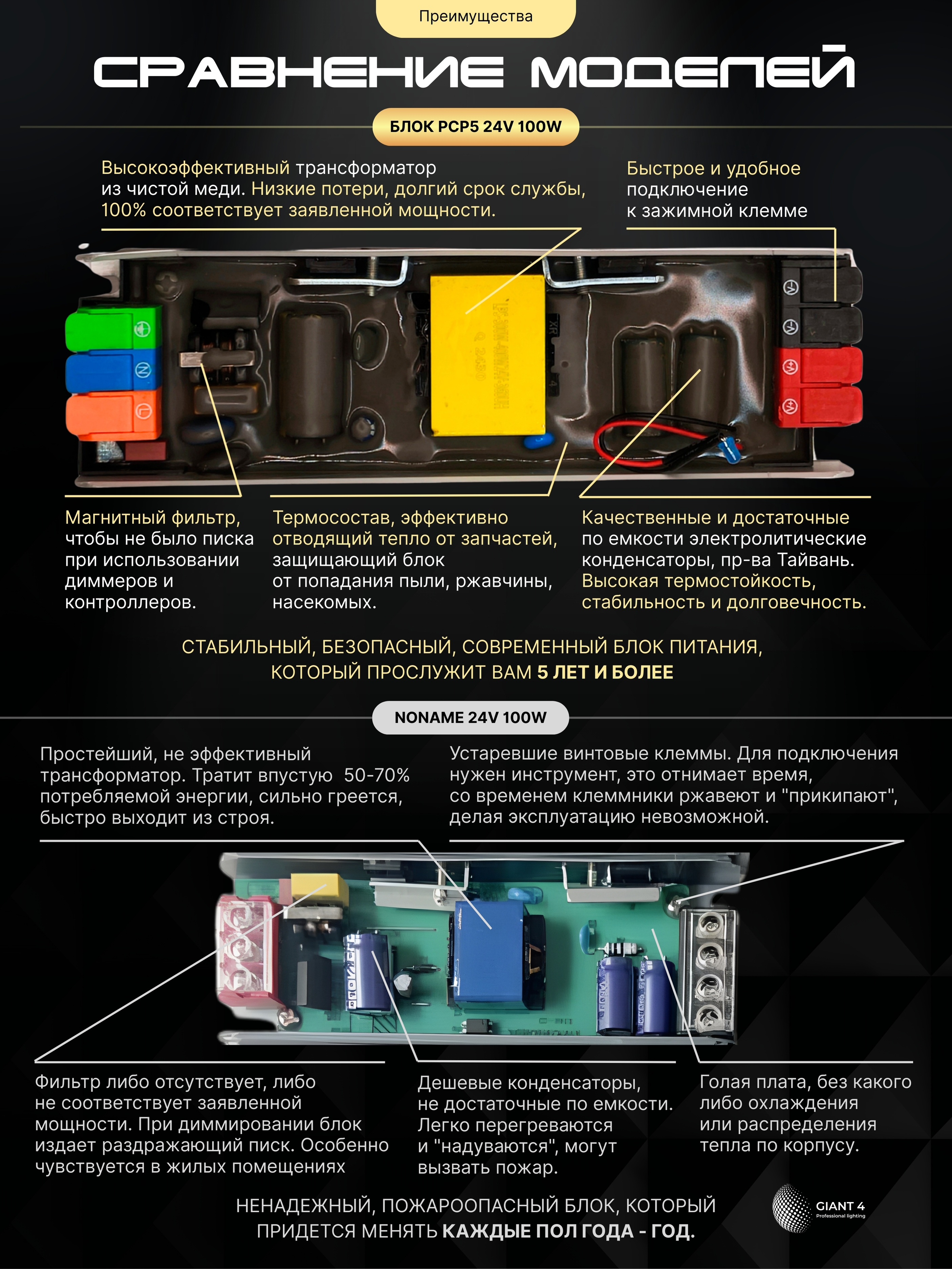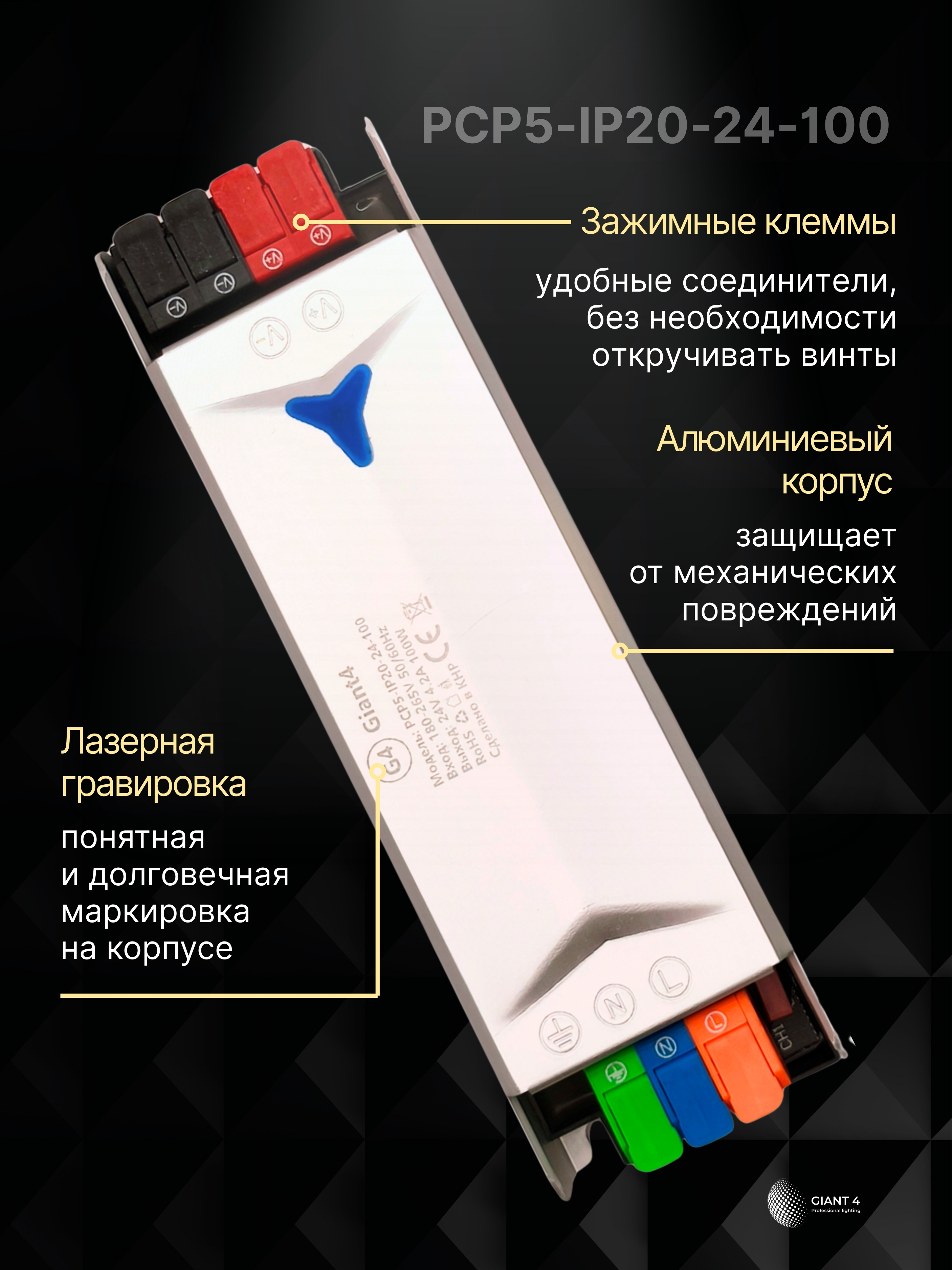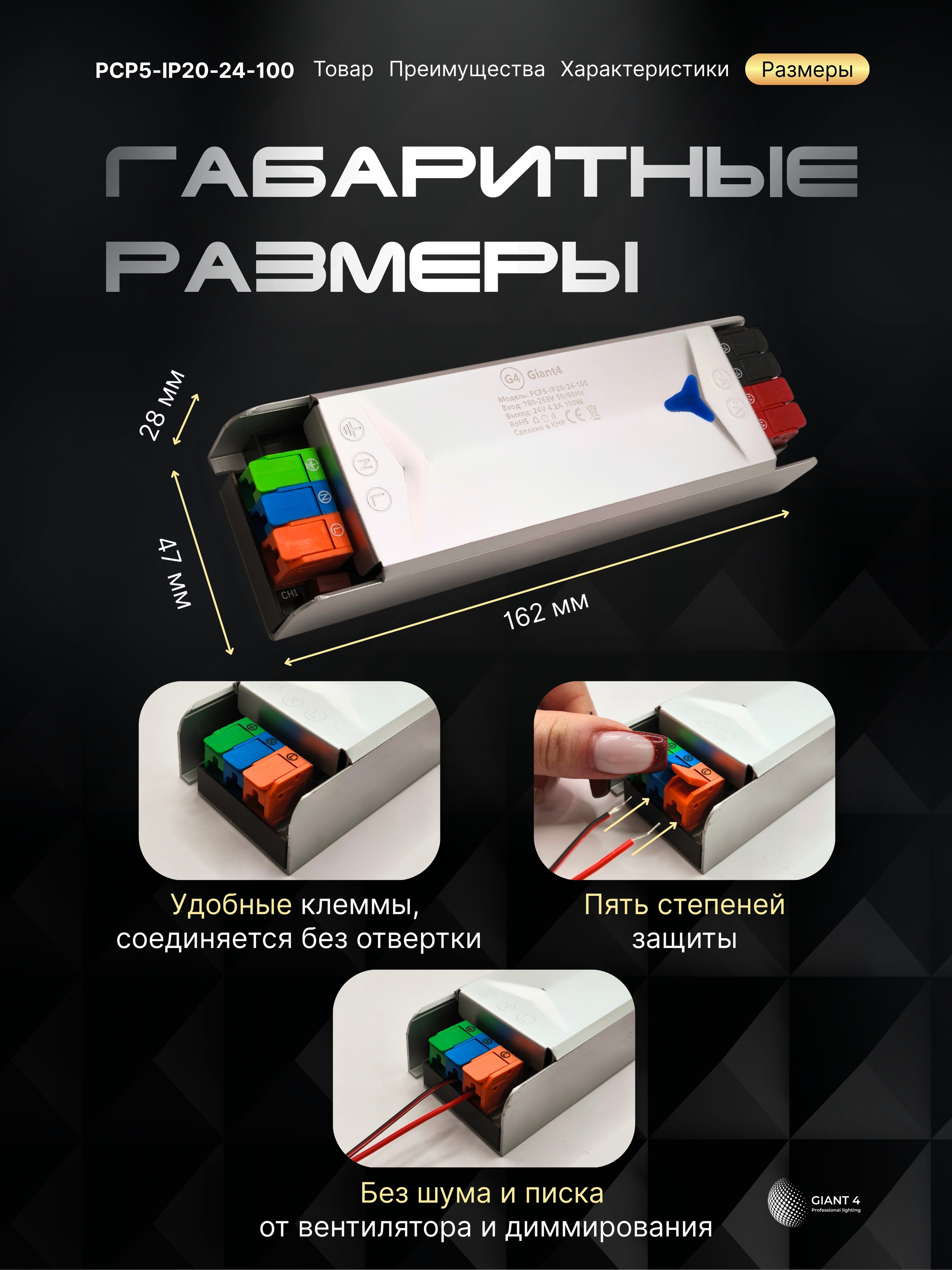 Компактный блок питания мощностью 100 Вт удобен для скрытого монтажа и хорошо подходит для освещения небольших комнат. Premium блок питания - это оптимальный выбор не только для небольших DIY-проектов, но и для серьезных задач, где важна стабильная работа и надежность. Отметим, что адаптер обладает двумя парами (+V и -V) зажимных клемм, которые облегчают процесс монтажа и делают его быстрым и комфортным.
