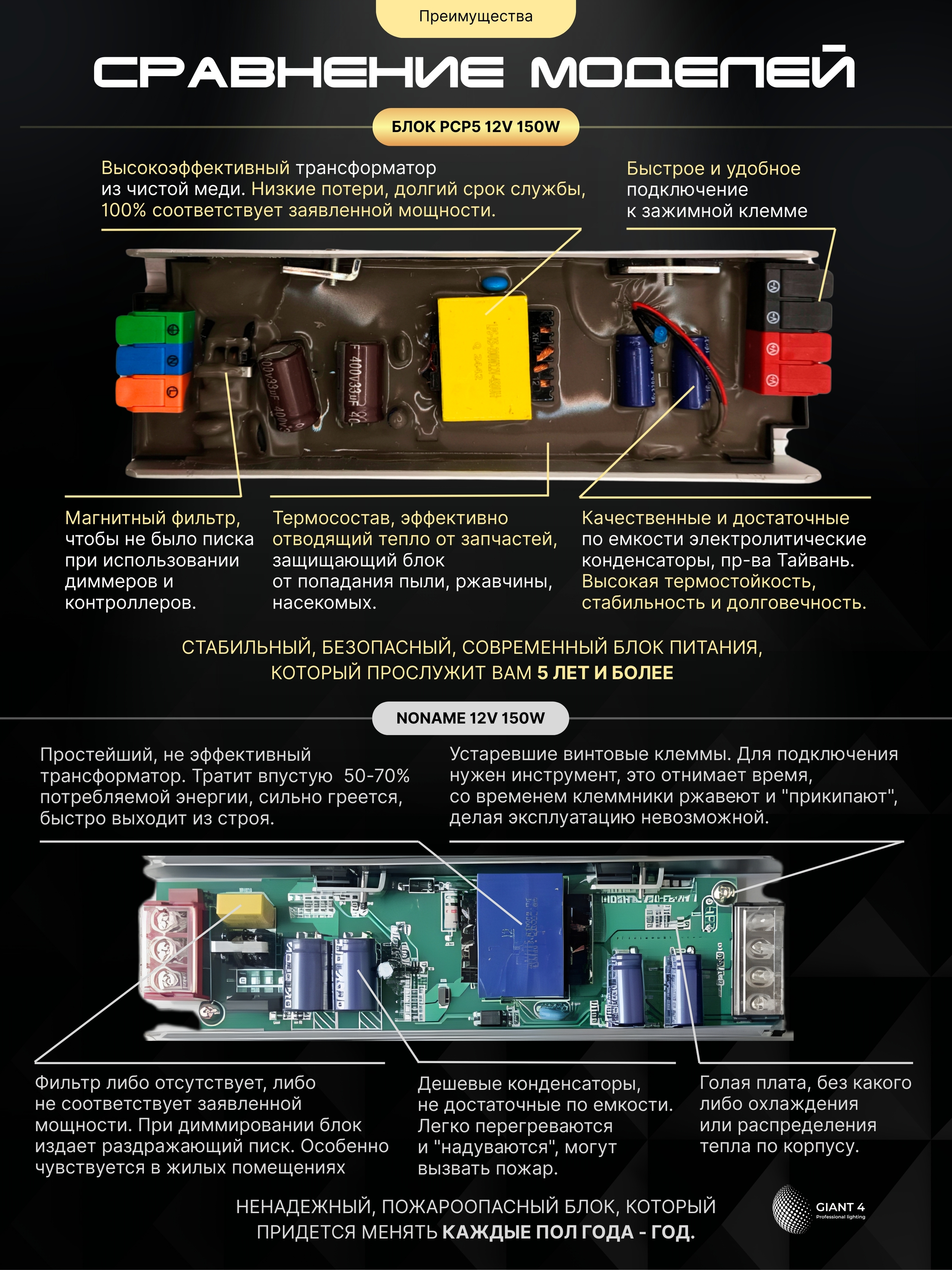 Мощности в 150 Вт достаточно, чтобы запитать популярные светодиодные ленты длиной до 6-8 метров. Например: