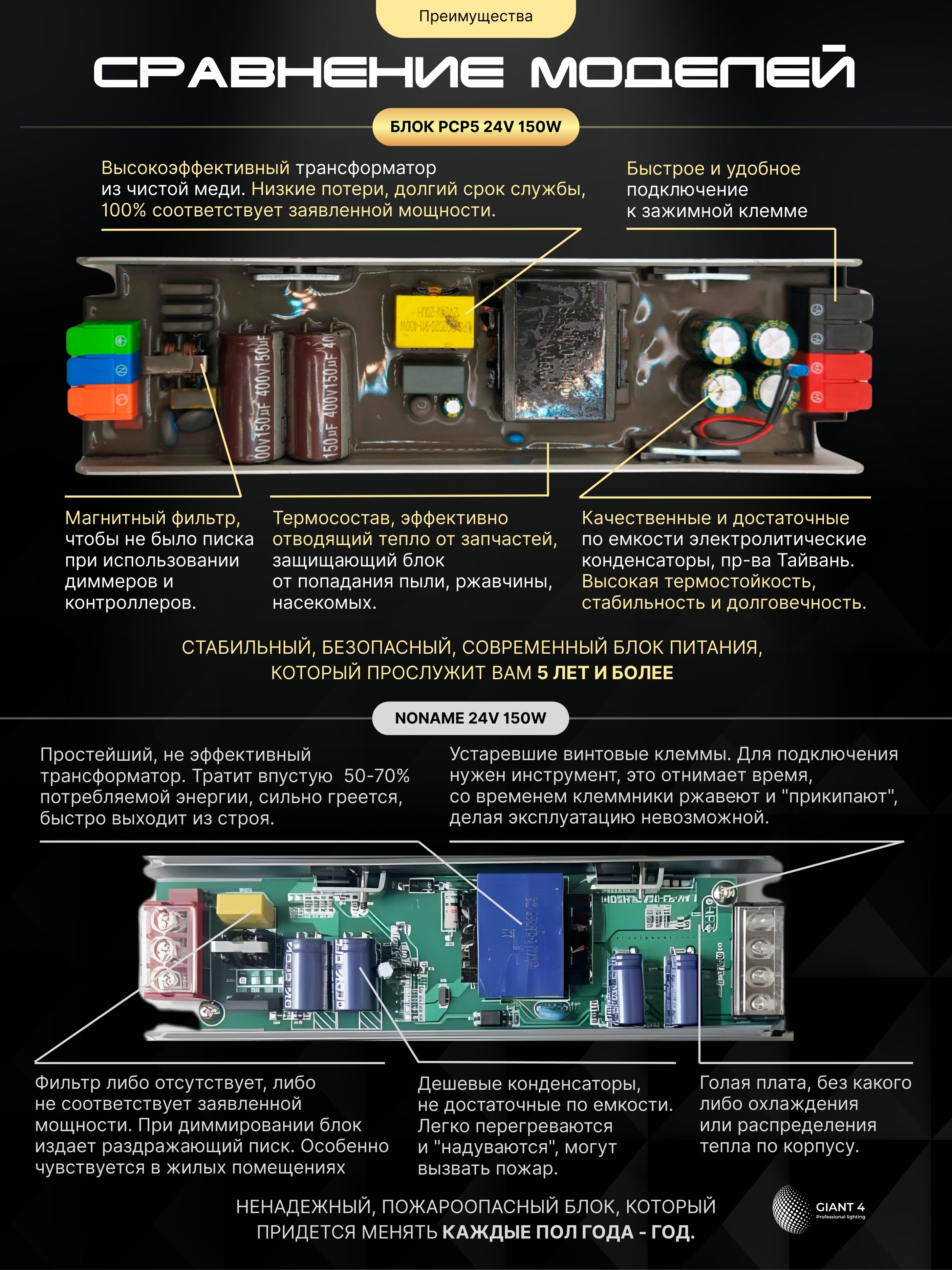 Компактный блок питания мощностью 150 Вт позволяет организовать освещение в небольших помещениях и подходит для подключения длинных и мощных светодиодных лент. Premium блок питания - это оптимальный выбор не только для небольших DIY-проектов, но и для серьезных задач, где важна стабильная работа и надежность. Отметим, что адаптер обладает двумя парами (+V и -V) зажимных клемм, которые облегчают процесс монтажа и делают его быстрым и комфортным.