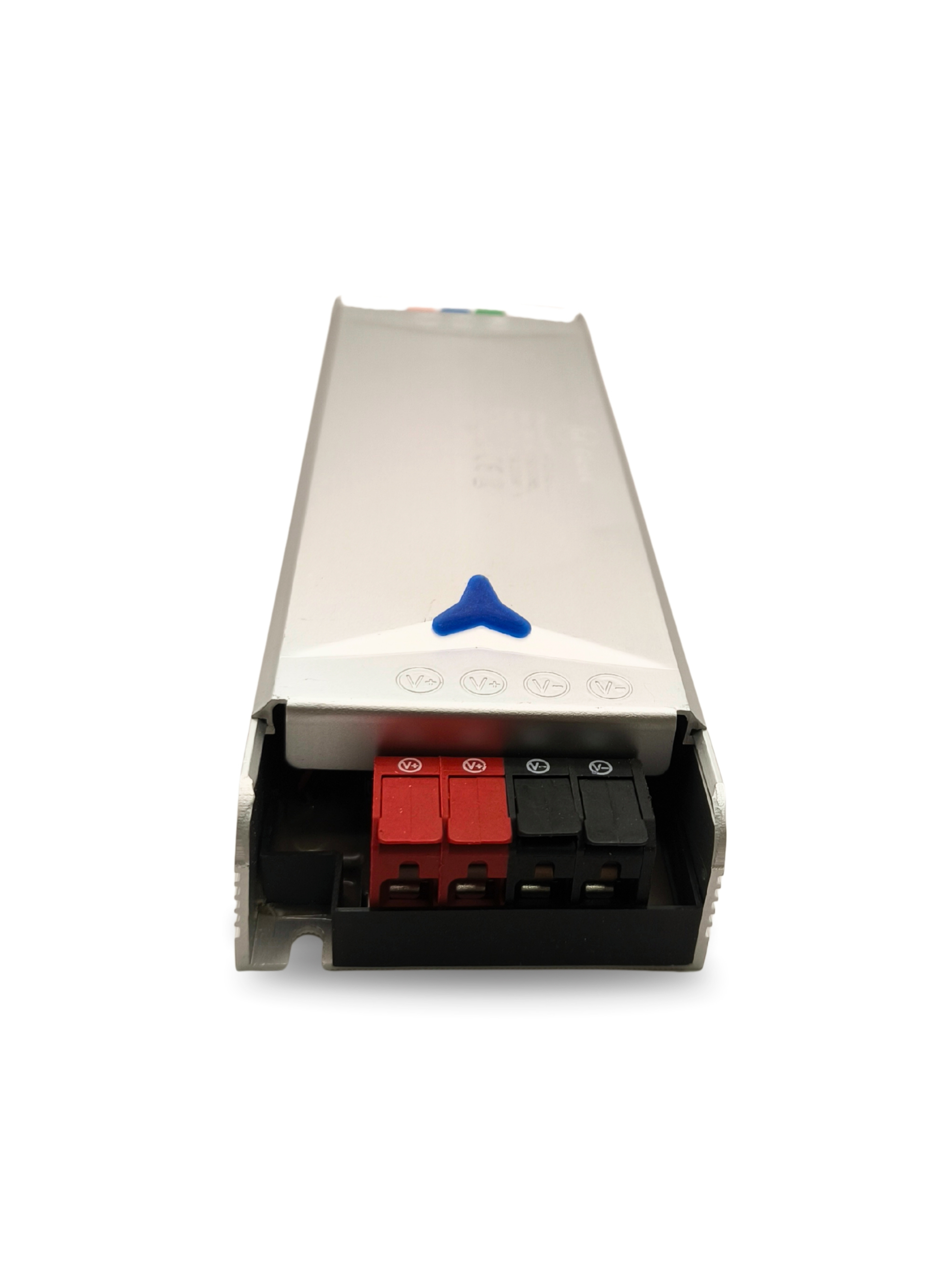 Блок оборудован удобными зажимными клеммами с двух сторон корпуса. Для подключения светодиодной ленты поднимите рычажок клеммы, вставьте подготовленный провод и защелкните. Такая конструкция делает установку моментальной и доступной для пользователей любого уровня подготовки.