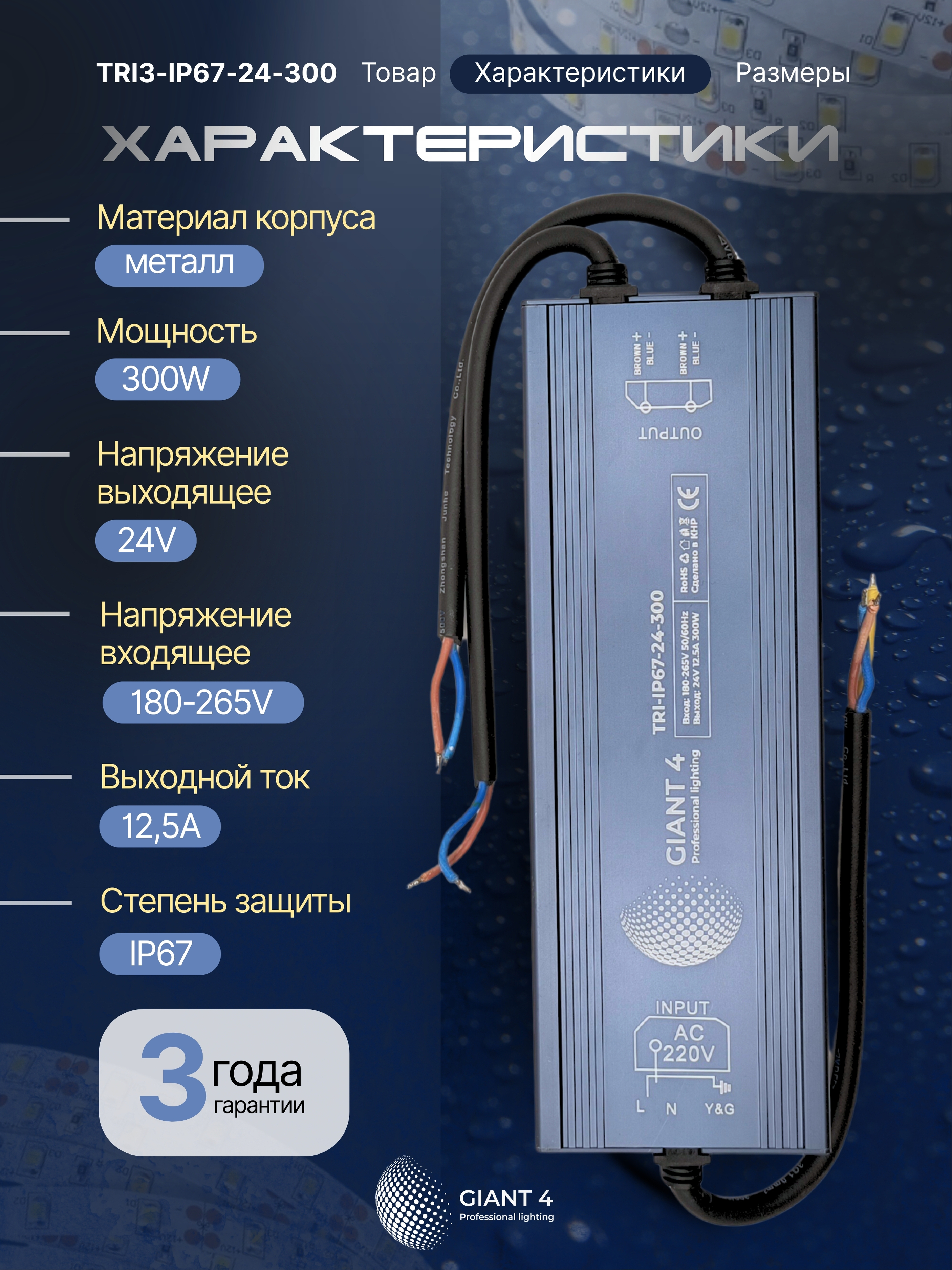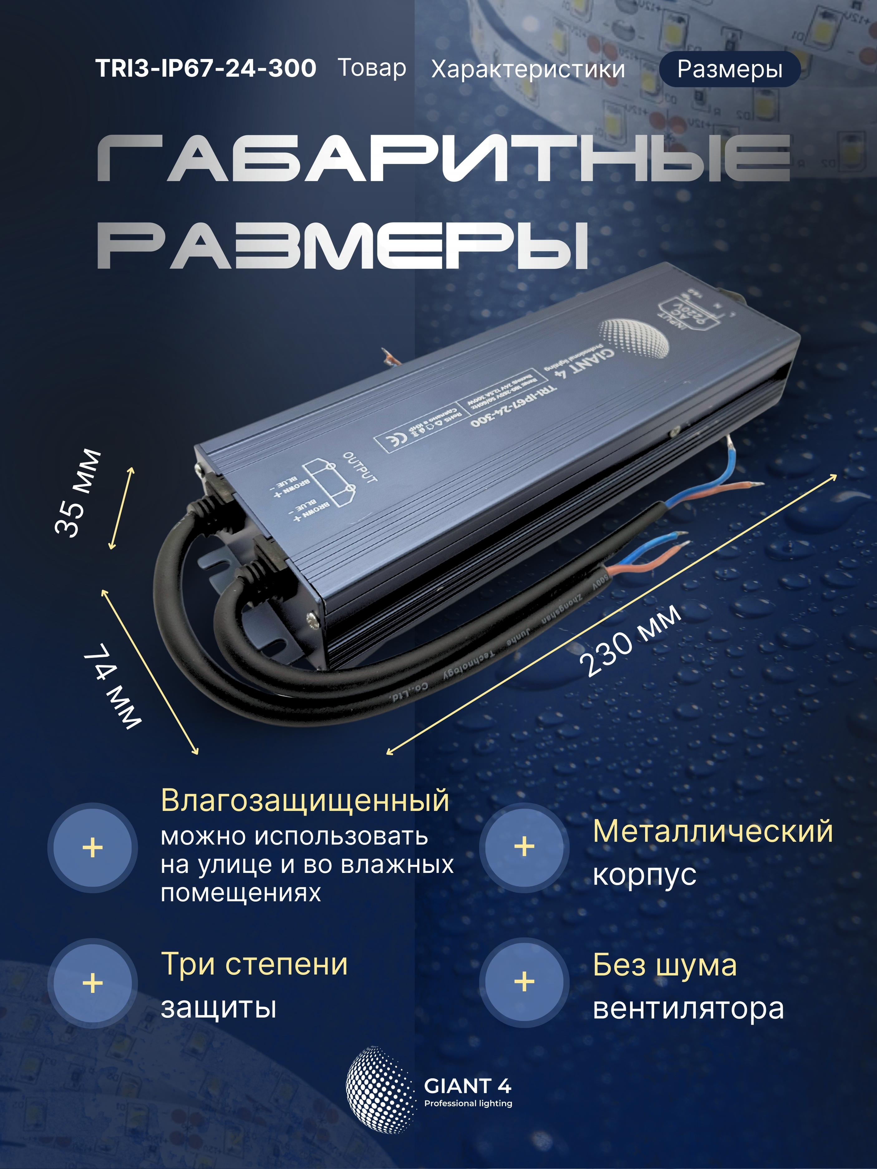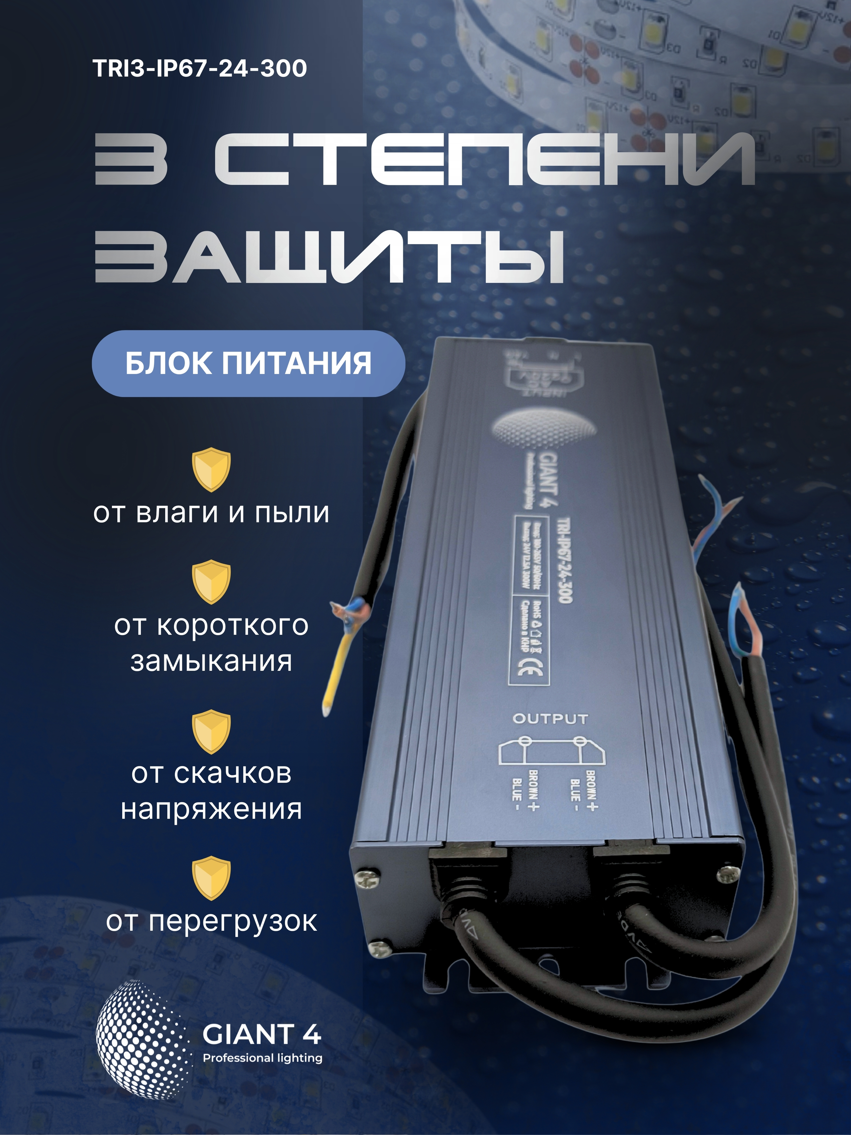 Прочный герметичный блок питания 300Вт 24В со степенью защиты IP67 специально разработан для работы на открытом воздухе. Он обеспечивает стабильное питание светодиодных лент в сложных условиях: в вывесках, архитектурной и наружной подсветке.