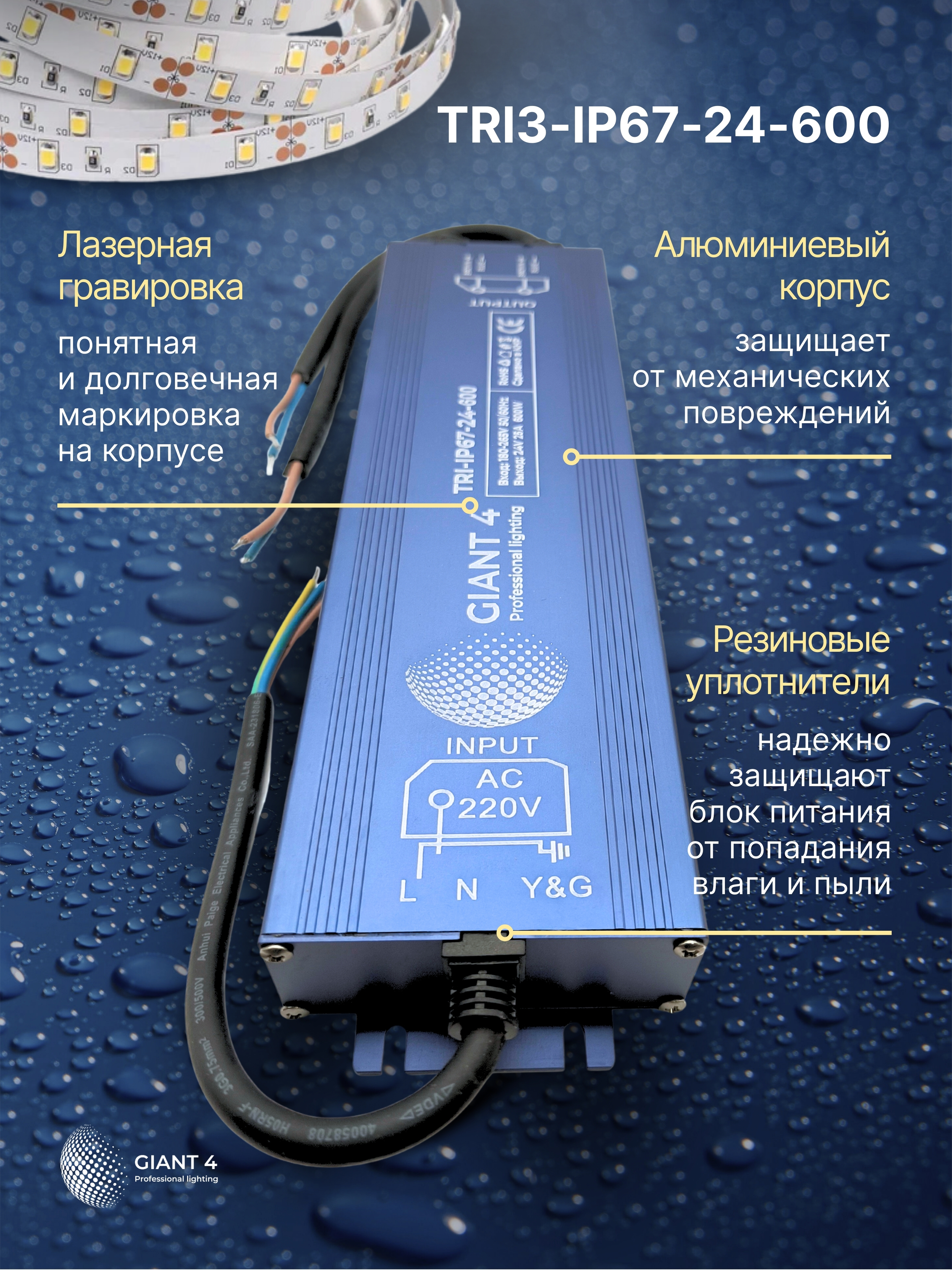 Герметичный блок питания для LED ленты 600 Вт 24 В ip67, 25А, влагозащищенный, металлический, гарантия 36 месяцев.