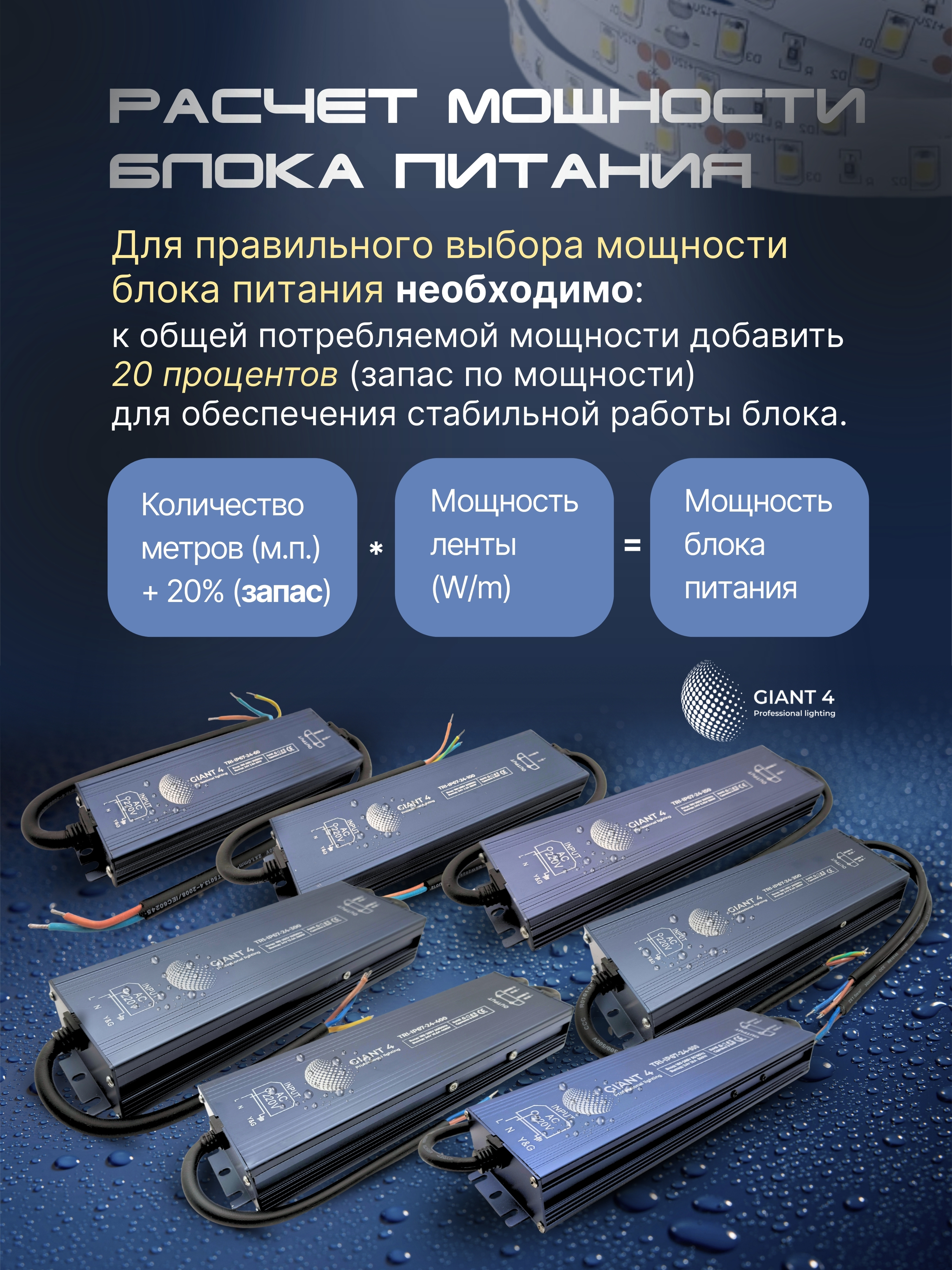 - Чтобы рассчитать максимальную длину подключаемой ленты (m), нужно разделить мощность блока 600вт (P) на потребляемую мощность ленты с запасом 20% (p + 20%). Эти 20% расходуются на сопротивление проводов и предохраняют блок от скачков напряжения.