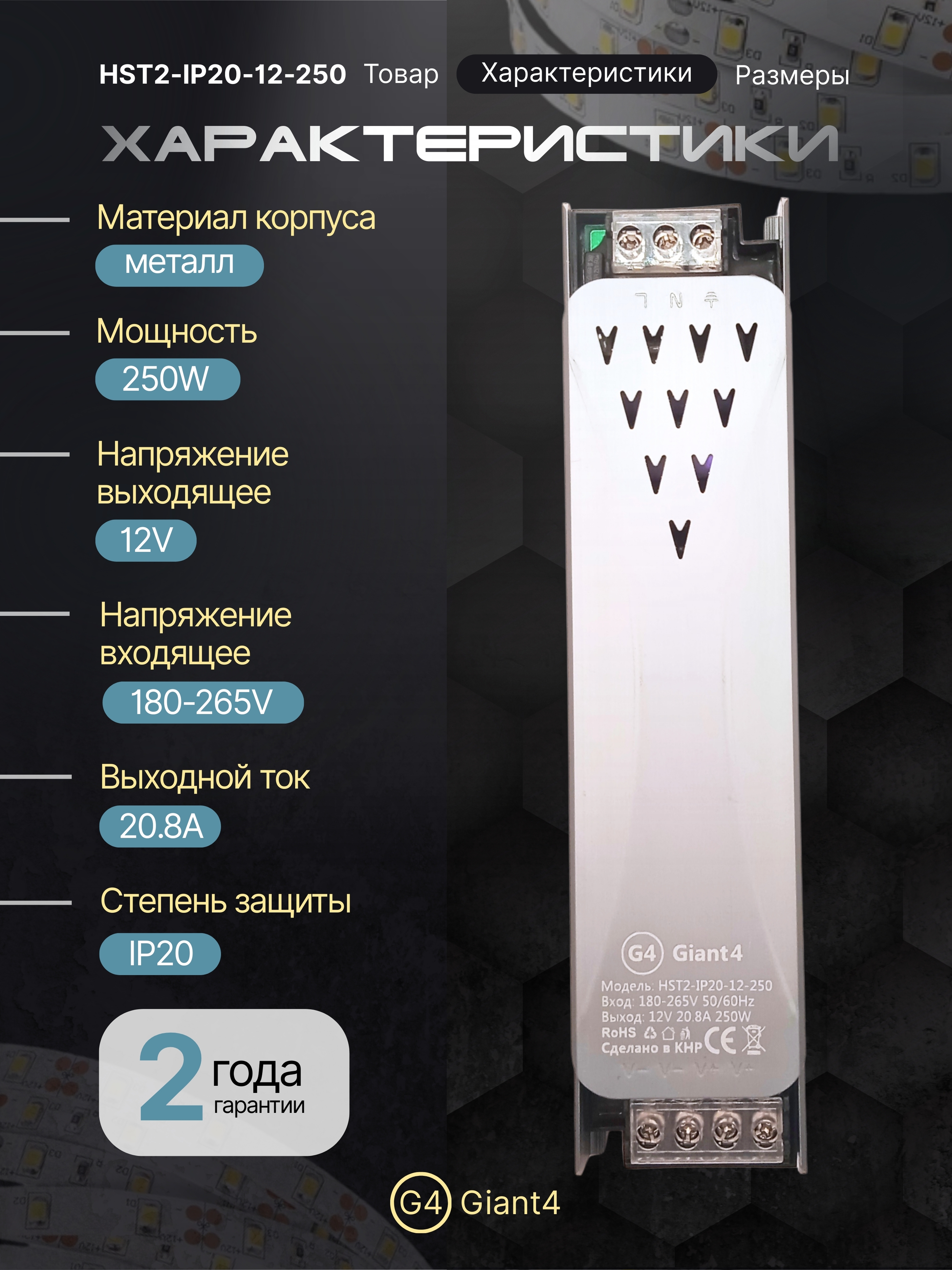 На узкий блок питания 250w 12v распространяется гарантия 2 года.