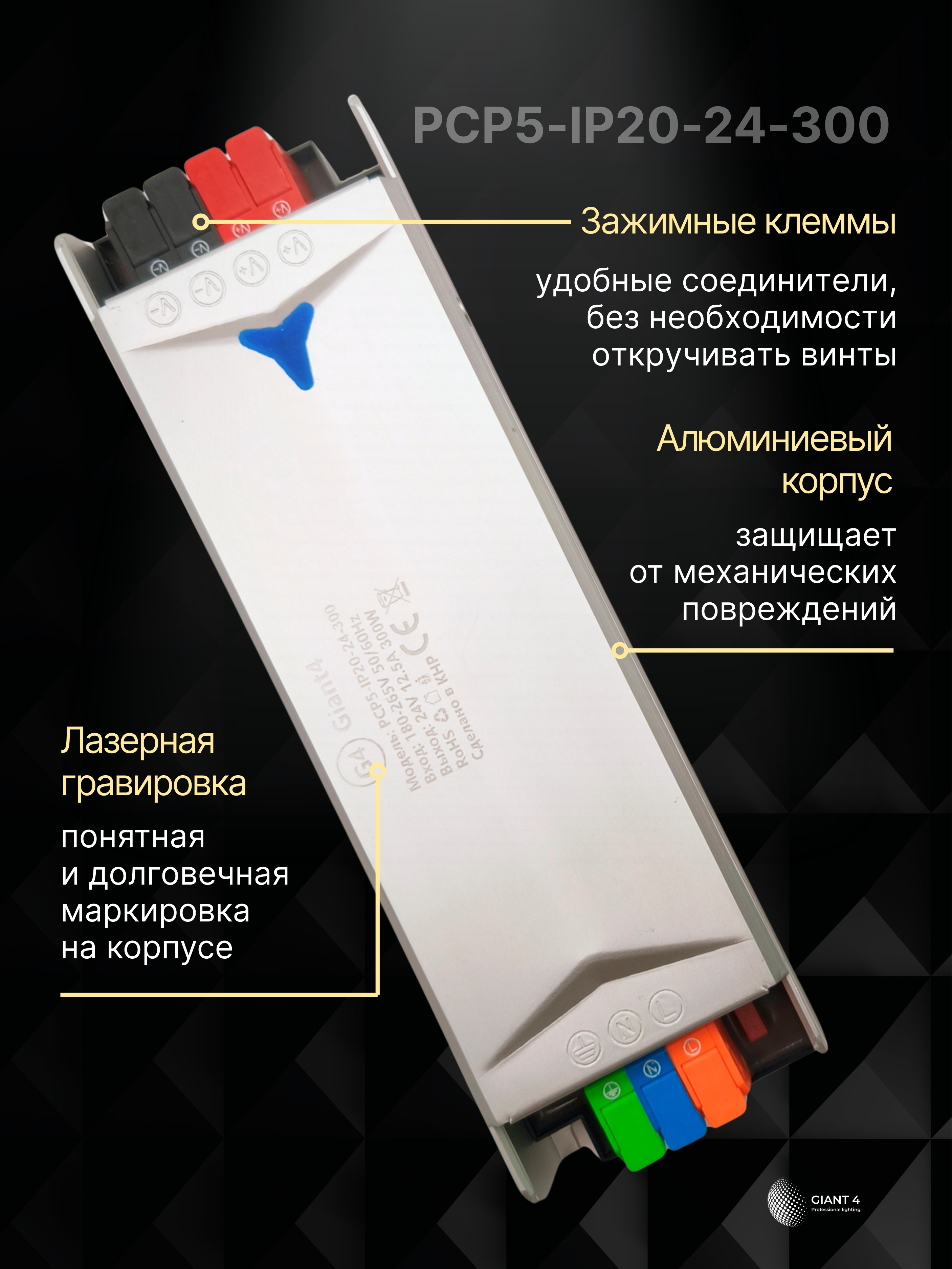 Компактный блок питания мощностью 300 Вт обладает высокой производительностью для создания систем освещения в жилых и коммерческих пространствах. Его мощности достаточно для питания протяженных участков светодиодных лент высокой яркости. Premium блок питания 24V 300W - это оптимальный выбор как для самостоятельного монтажа, так и для профессиональных систем освещения, где важна стабильная работа и надежность. Отметим, что адаптер обладает двумя парами (+V и -V) зажимных клемм, которые облегчают процесс монтажа и делают его быстрым и комфортным.