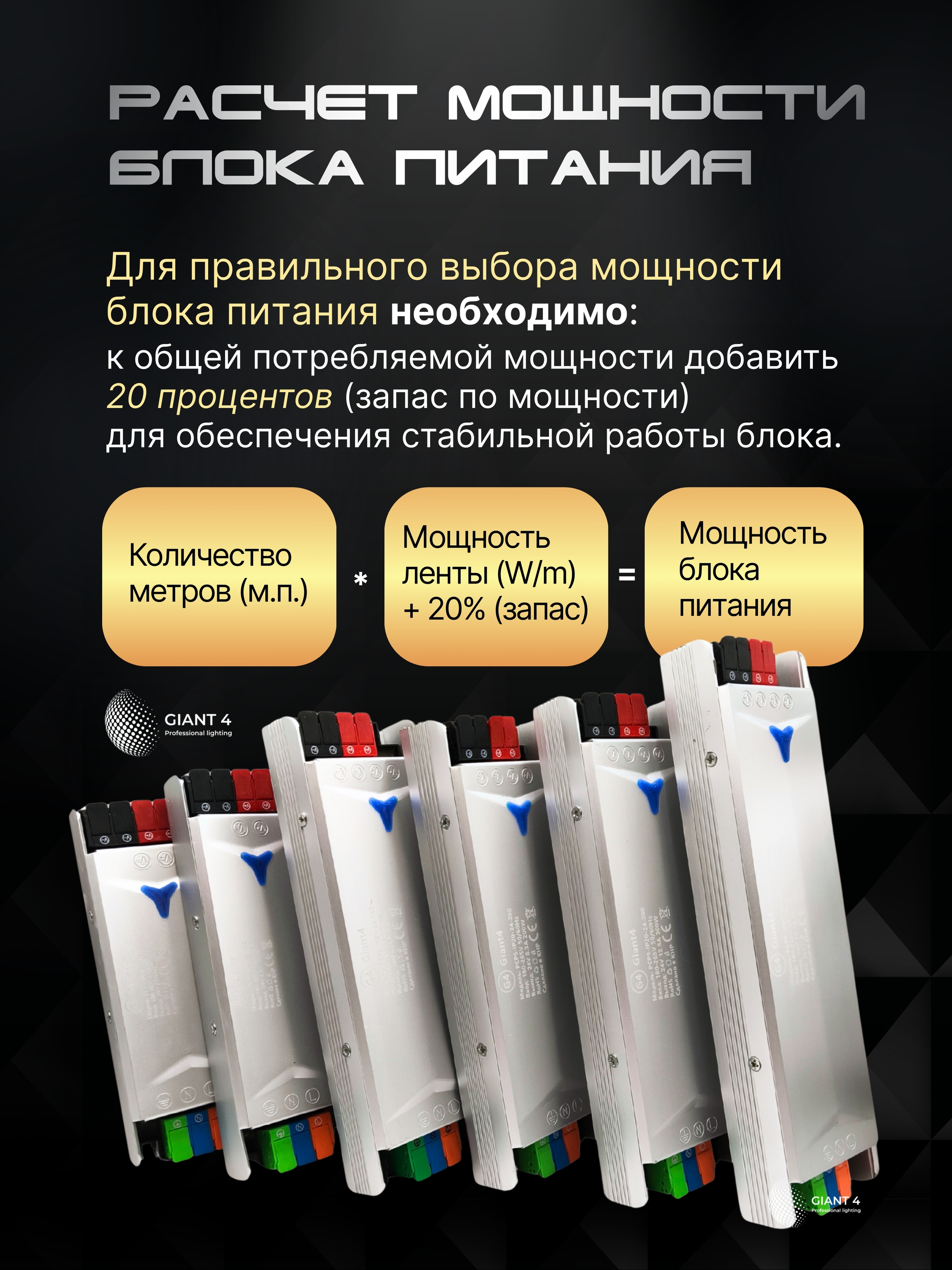 Максимальная длина ленты = Мощность блока / (Мощность 1 метра ленты + 20%)