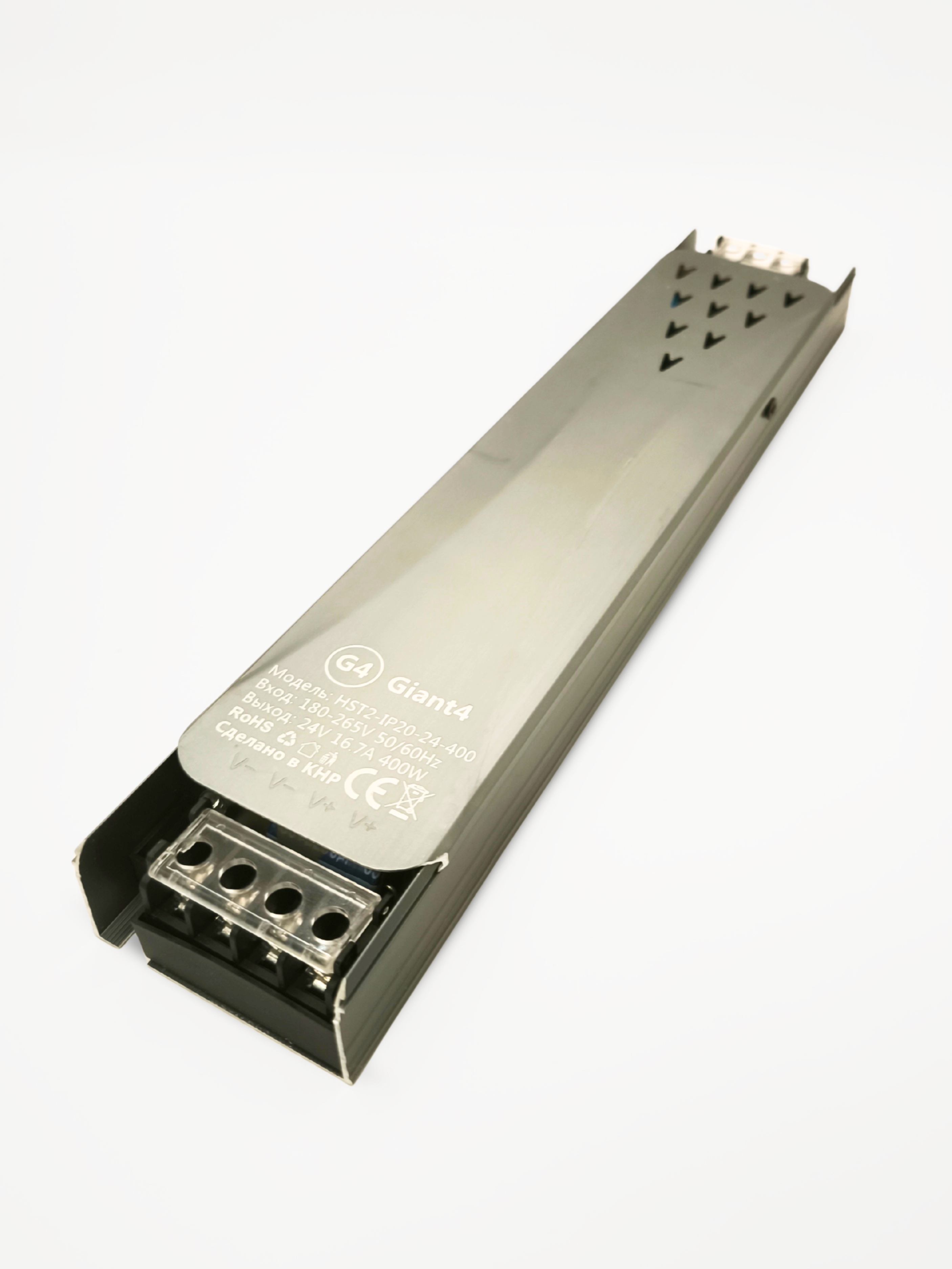 Блок питания 24 Вольта 400вт 16.7 ампер для светодиодной ленты. Это мощный блок питания, способный работать без вентилятора. Обычные модели поставляются с встроенным куллером, который гудит при работе как ноутбук. Иногда такой шум бывает неприемлем, особенно когда речь идет о подсветке в жилых помещениях: в спальне, зале или на кухне. Эту проблему отлично решают блоки питания серии Superslim. Несмотря на отсутствие активного охлаждения в виде вентилятора, данный блок питания способен снабдить энергией очень большое количество светодиодной ленты. Например, ленты 2835 120led 24v 12w к нему можно подключить до 27 метров с запасом мощности 20%.