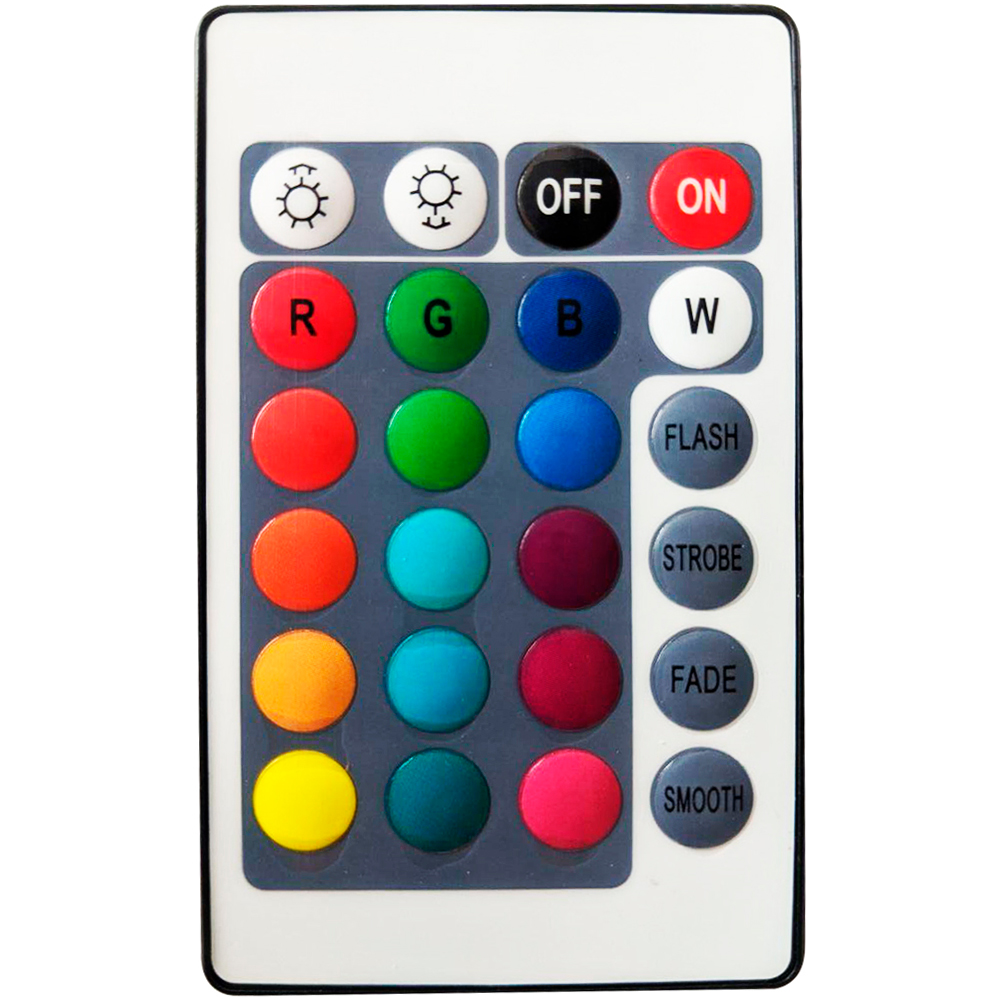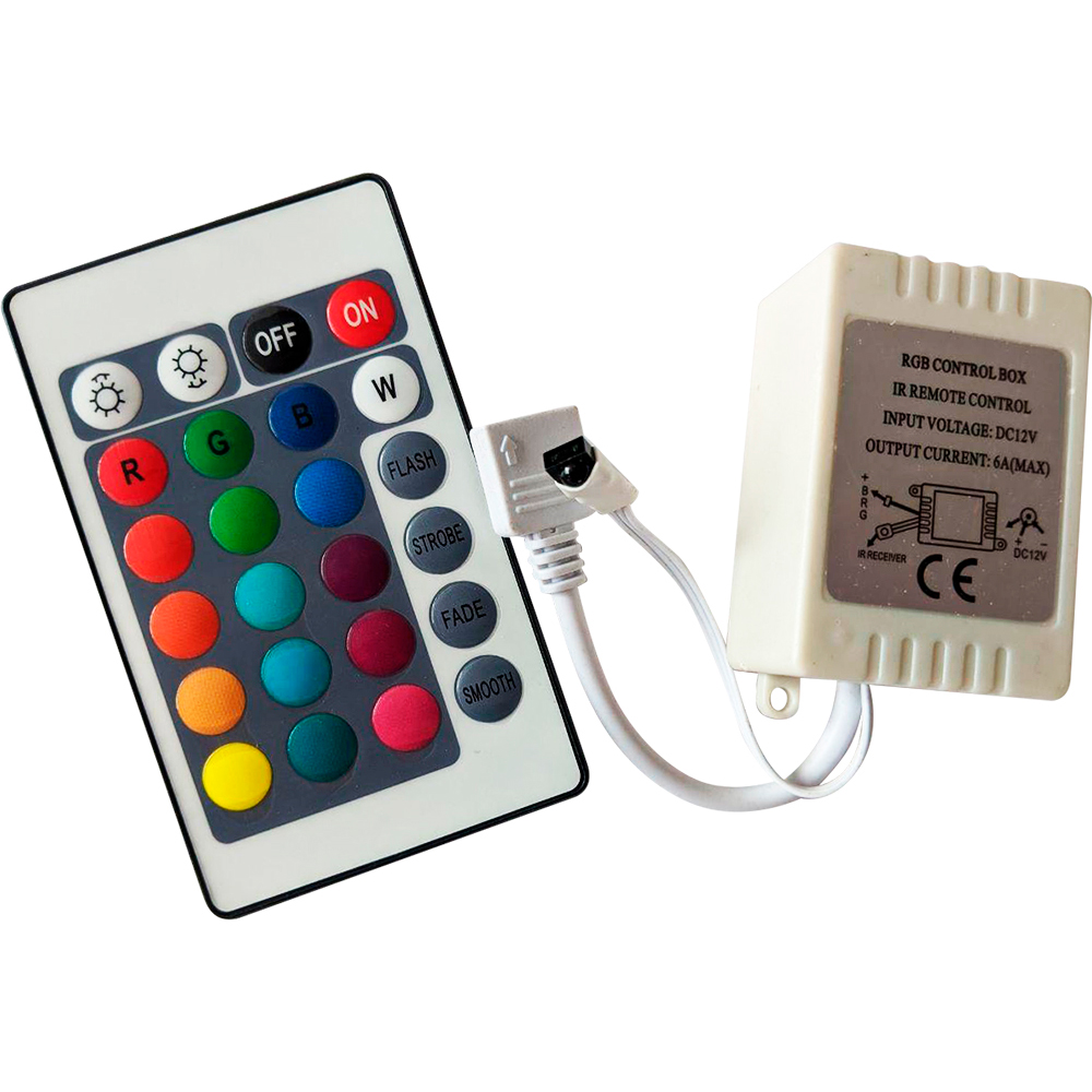 Контроллер RGB с ИК пультом 72W 12V - самое недорогое и популярное решение для управления RGB лентой. Благодаря своей дешевизне, он зачастую используется в готовых комплектах светодиодной ленты. Также он применяется для светодиодных люстр, RGB лампочек, прожекторов и прочего светодиодного оборудования. Однако, рекомендуем обращать внимание на напряжение. Кроме дешевизны особых плюсов нет: из-за того, что этот пульт контроллера работает на инфракрасном канале (IR / ИК), управлять с помощью него лентой бывает немного неудобно, ведь между контроллером и пультом необходим прямой визуальный контакт. Иными словами, если вы хотите убрать сам контроллер подальше и управлять лентой не вставая с дивана - ИК контроллер - это не ваш вариант. Зато несколько таких контроллеров можно использовать в одной комнате, не опасаясь, что они будут реагировать друг на друга.