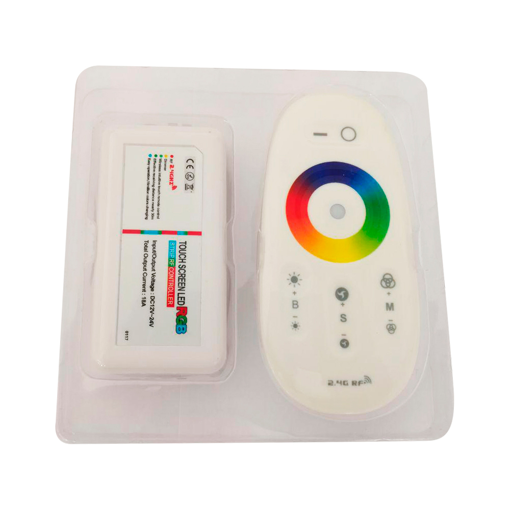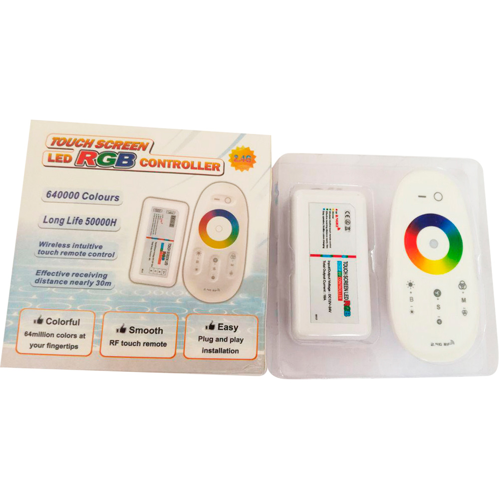 В остальном это обычный контроллер с сенсорным пультом. Те же 9 программ, тот же радио пульт, работающий сквозь препятствия на расстоянии до 15-20 метров, то же сенсорное кольцо в центре. Логичный и удобный вариант для тех, кто берет RGBW ленту.