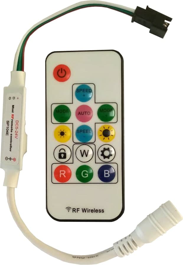 Из минусов можно привести то, что его невозможно перепрограммировать и вообще как-либо изменить функционал. Довольно скудно реализовано управление яркостью ленты (всего 3 уровня яркости). Также необходимо учитывать, что он рассчитан на подключение к адресной ленте с чипами ws2812b и ws2811, а также - к другим трехконтактным лентам. Для ws2813, ws2815, ws2818 и других лент с запасным каналом данных, придется отрезать провода от коннектора и соединять с лентой при помощи изоленты, зажимных клемм (вроде WAGO) или пайки. Кроме того, следует знать, что контроллер Sp104e не подходит для одноцветной адресной ленты.