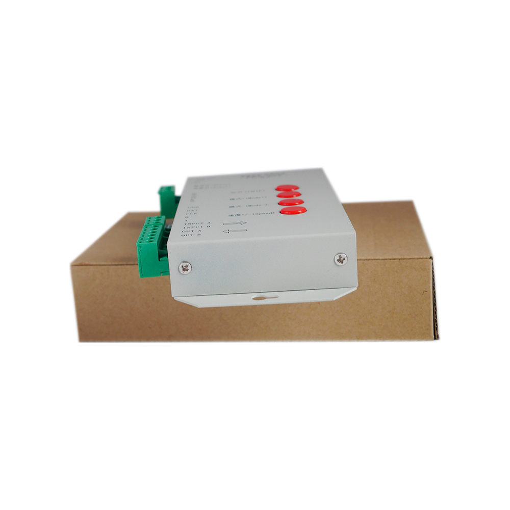 Контроллер Т1000 для адресной ленты - это крепкий оловянный солдатик в армии современных контроллеров. Светодиодная лента легко и надежно подключается к контроллеру с помощью винтовых зажимов. Т1000 управляется всего четырьмя кнопками: "Set" - сброс на начало списка программ, "Mode" - переключение программы вперед, "Speed+" - увеличение скорости проигрывания, "Speed-" - уменьшение скорости проигрывания.