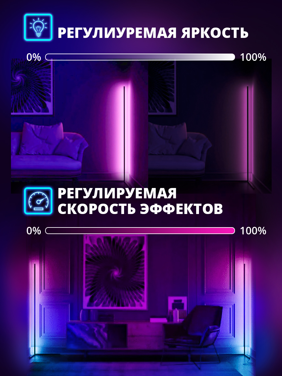 Минималистичный угловой светильник с дистанционным управлением Nordic сочетает в себе дизайнерские инновации и безупречное удобство. Конструкция лампы Nordic подразумевает его использование в качестве углового напольного торшера, хотя он и не является торшером в привычном понимании. Светильник Nordic RGB идеально вписывается в современный минималистичный интерьер спальни, гостиной или кухни. Выбирайте один из 330 режимов работы, настройте яркость и скорость анимации, чтобы создать идеальную атмосферу в своем доме!