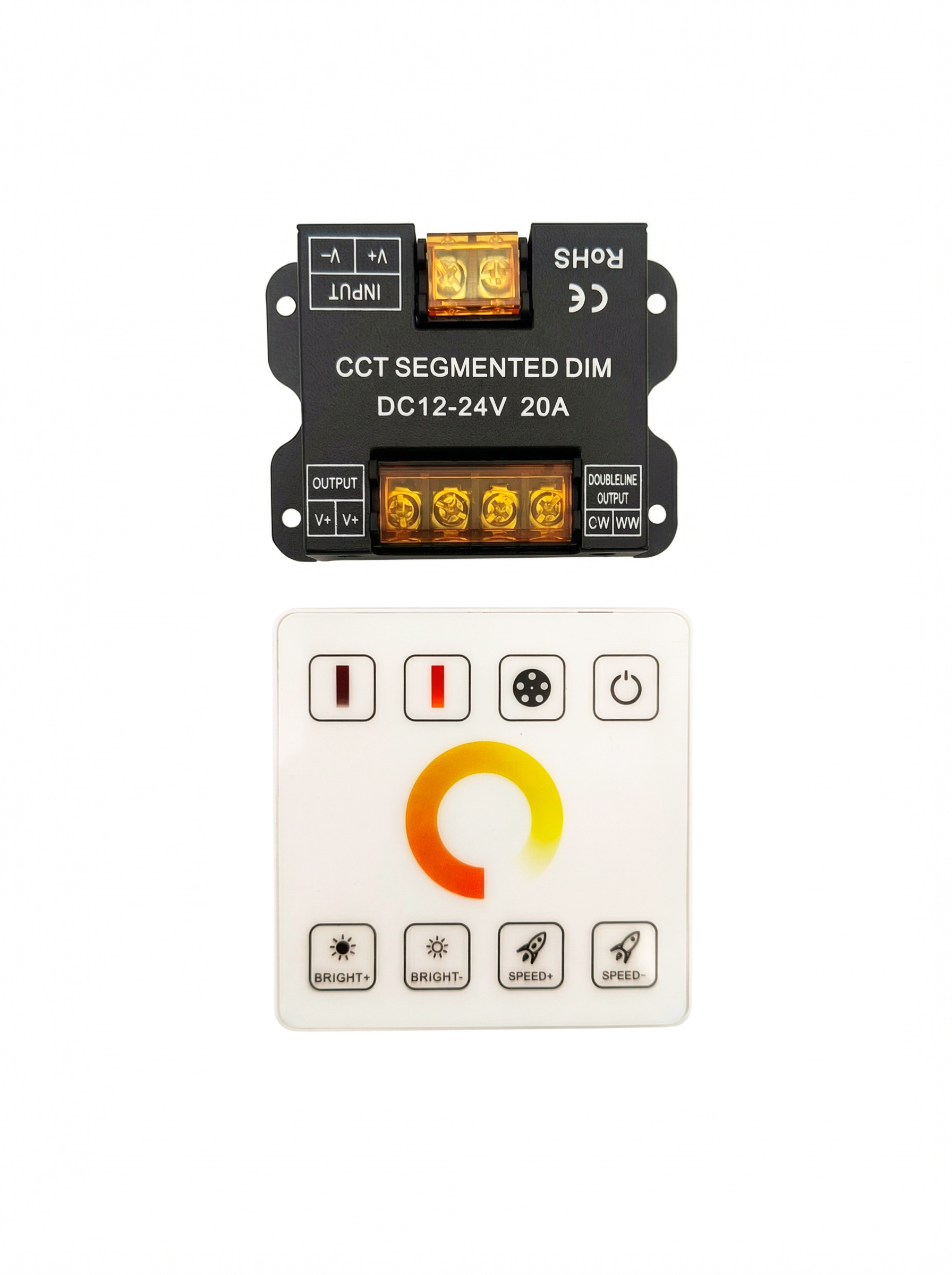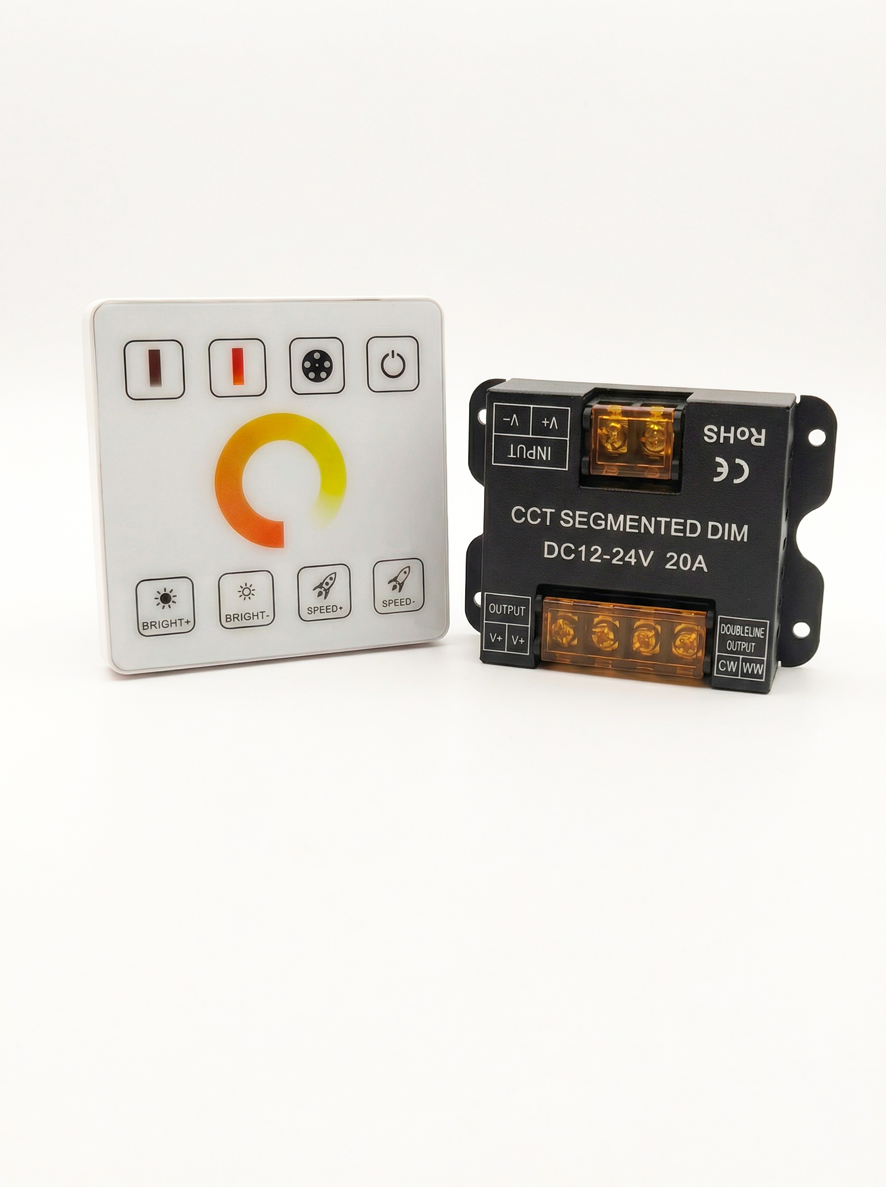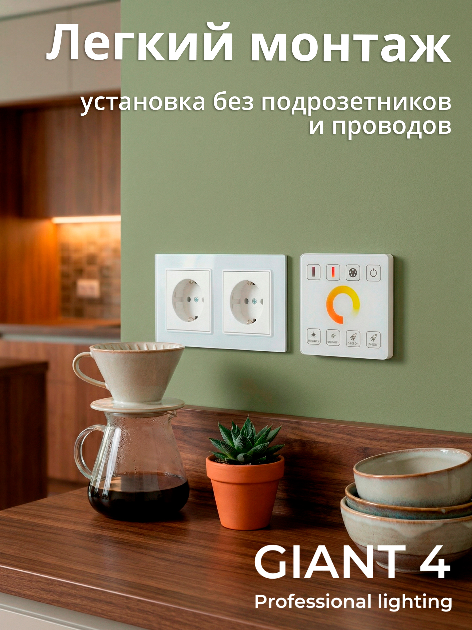 Сенсорная настенная панель для управления CCT лентой. Это простой и удобный контроллер для управления двухцветной подсветкой в квартире. Сенсорная панель позволяет точно настраивать оттенок свечения от белого теплого (2700К) до белого холодного (6500К). Контроллер с настенной панелью удобно использовать в качестве выключателя, вместо пульта для подсветки, при этом всегда зная где он установлен. При этом установка панели не требует проводки, т.к. она работает от батареек (до 12 месяцев на полных батарейках), но об этом ниже. Сенсорная панель CON-RFPAN-CCT - это надежное устройство, изготовленное из высококлассных материалов и компонентов, панель не зависает, работает мгновенно без задержек и ошибок. Гарантия на панель - 2 года. Мощность подключаемой ленты - 240 ватт для 12В и 480 ватт для 24в. Такой мощности хватает для подключения до 20 метров ленты COB CCT 576LED (рассчитано с запасом мощности).