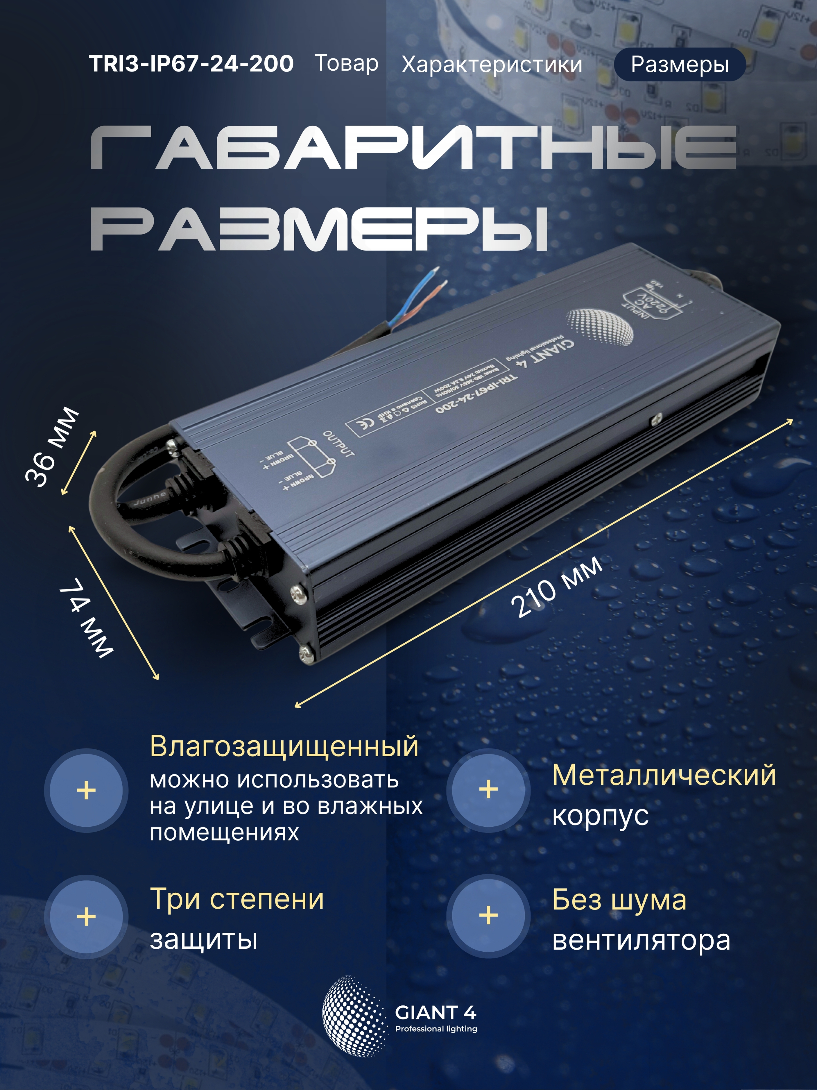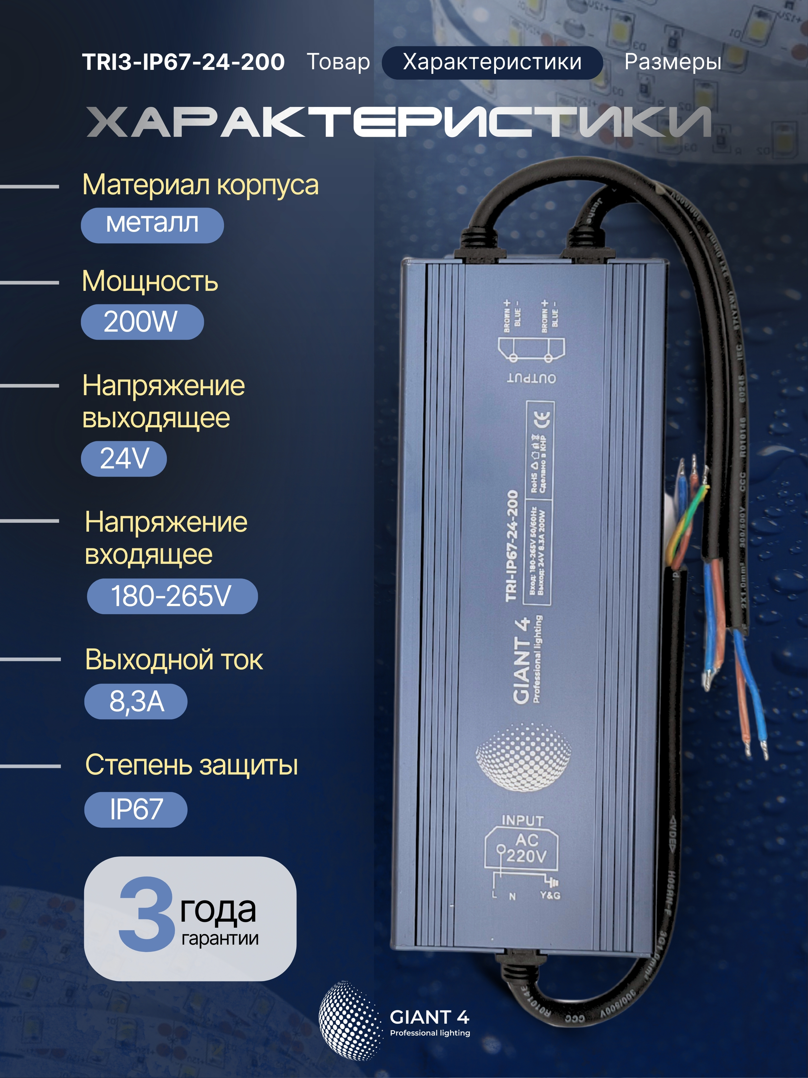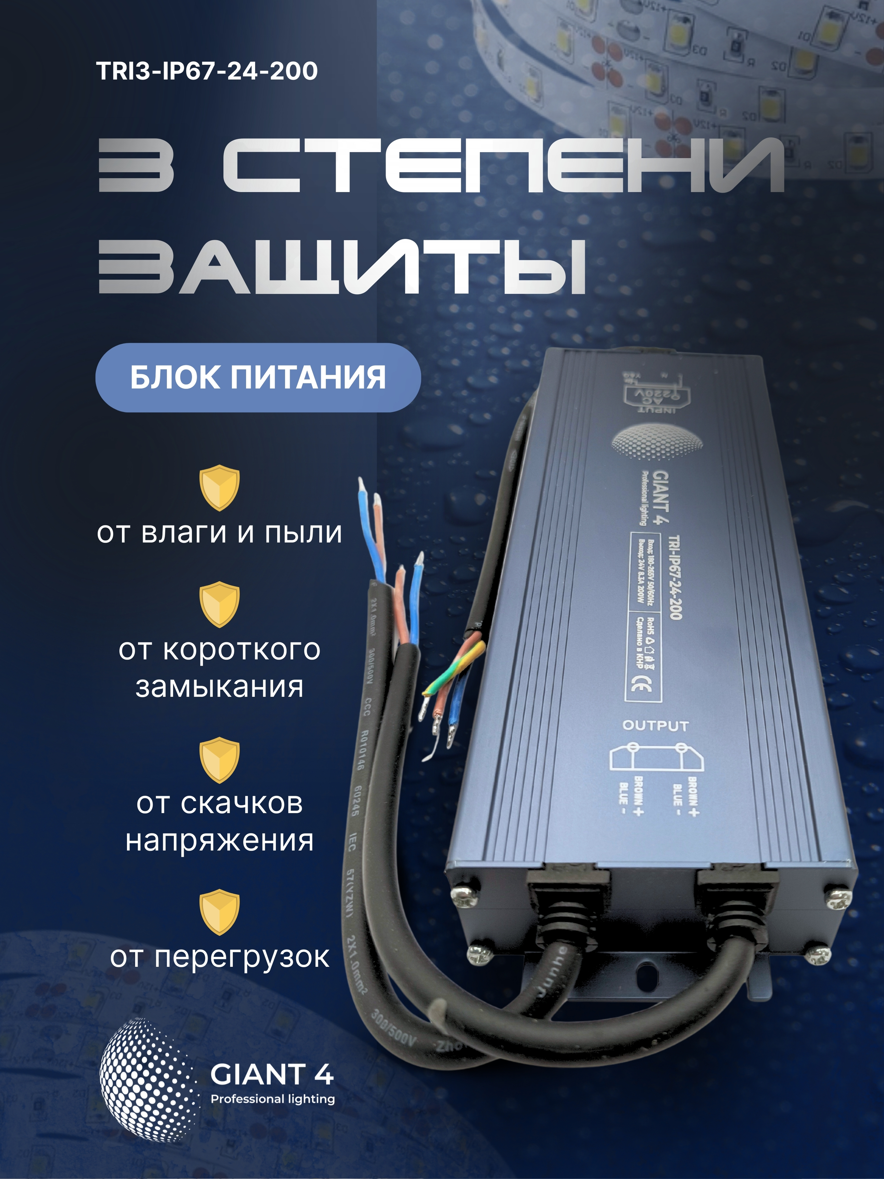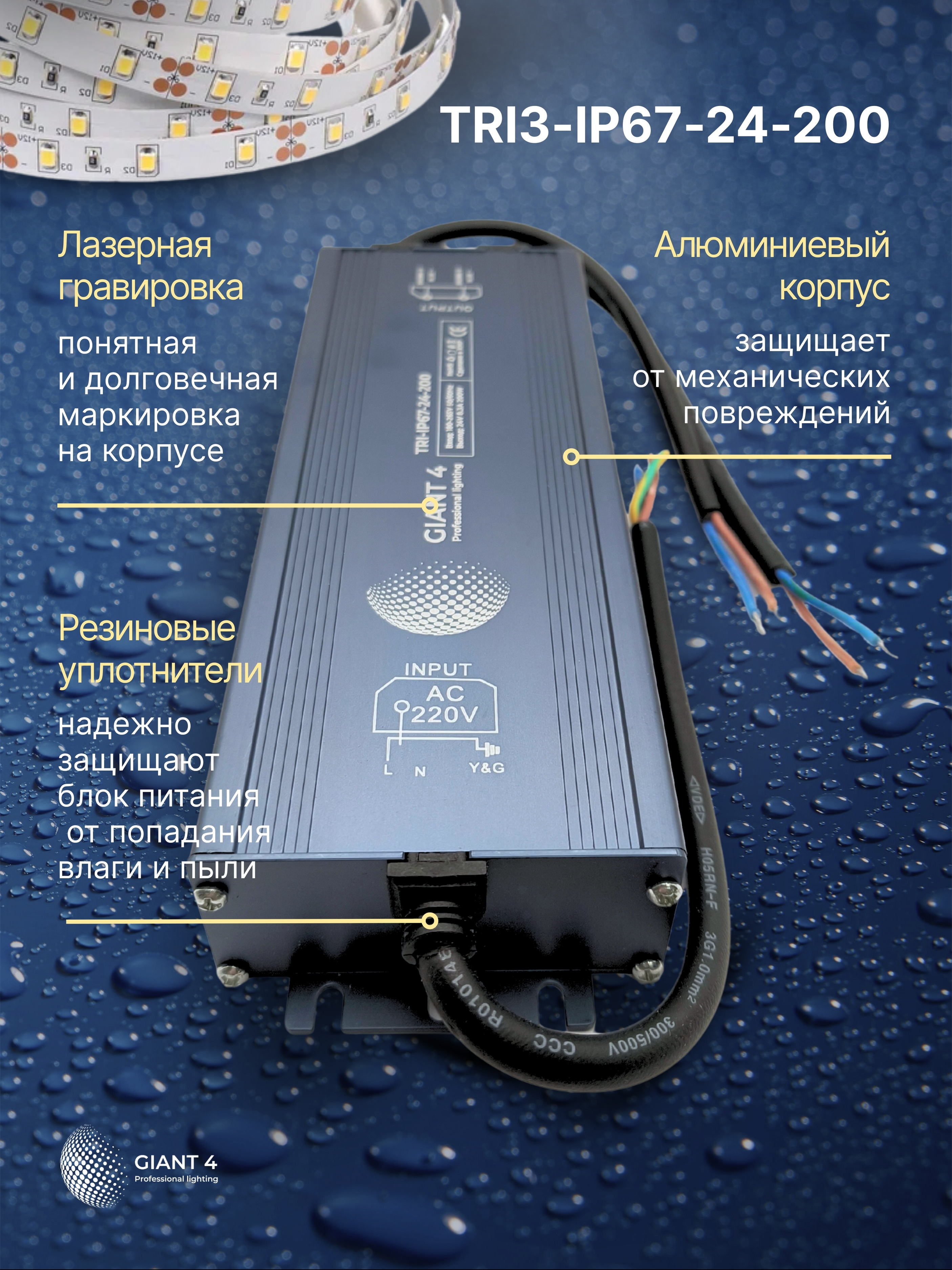 Герметичный блок питания для LED ленты 200 Вт 24 В ip67, 8.33А, влагозащищеный, металлический, гарантия 36 месяцев.