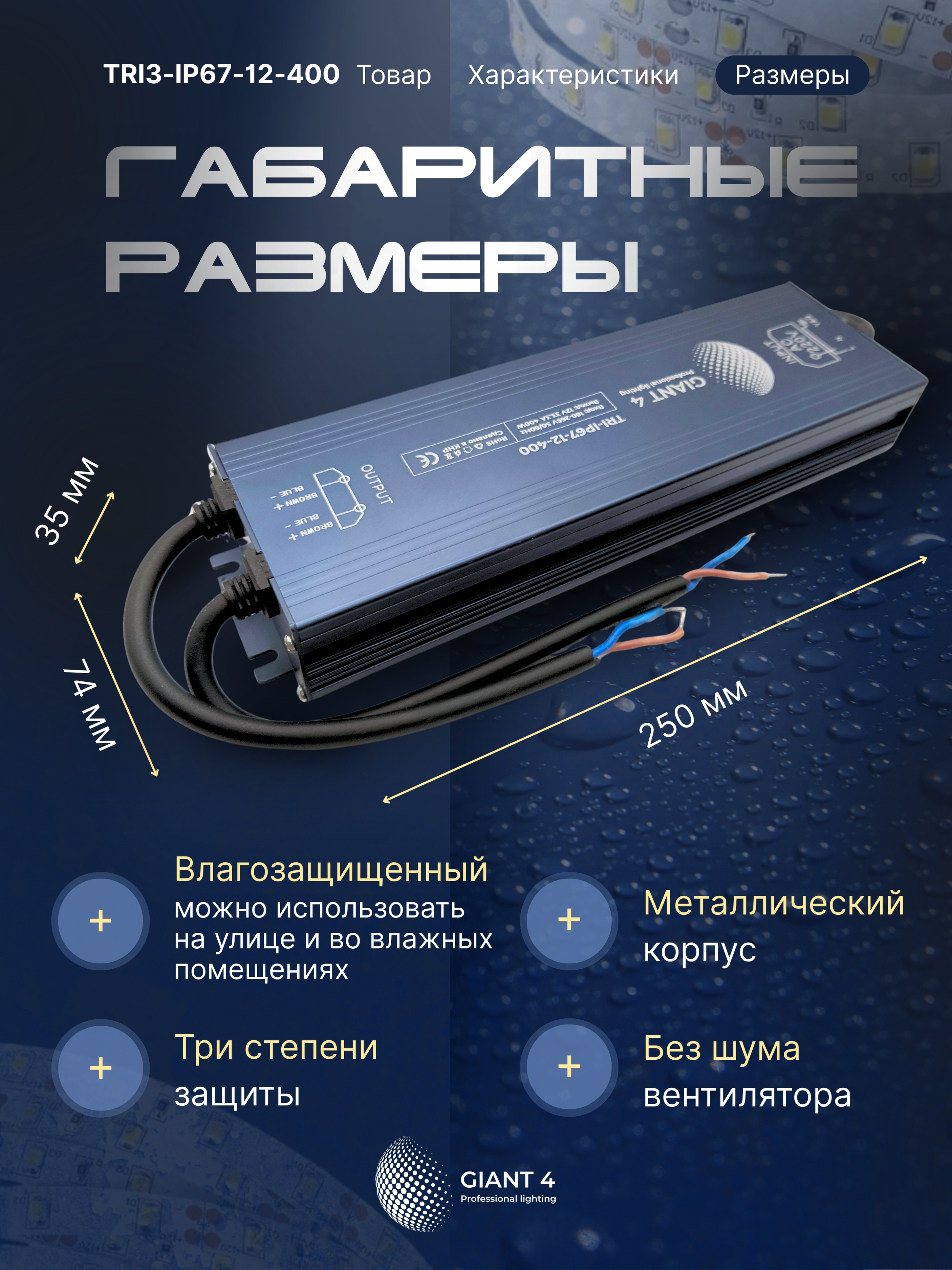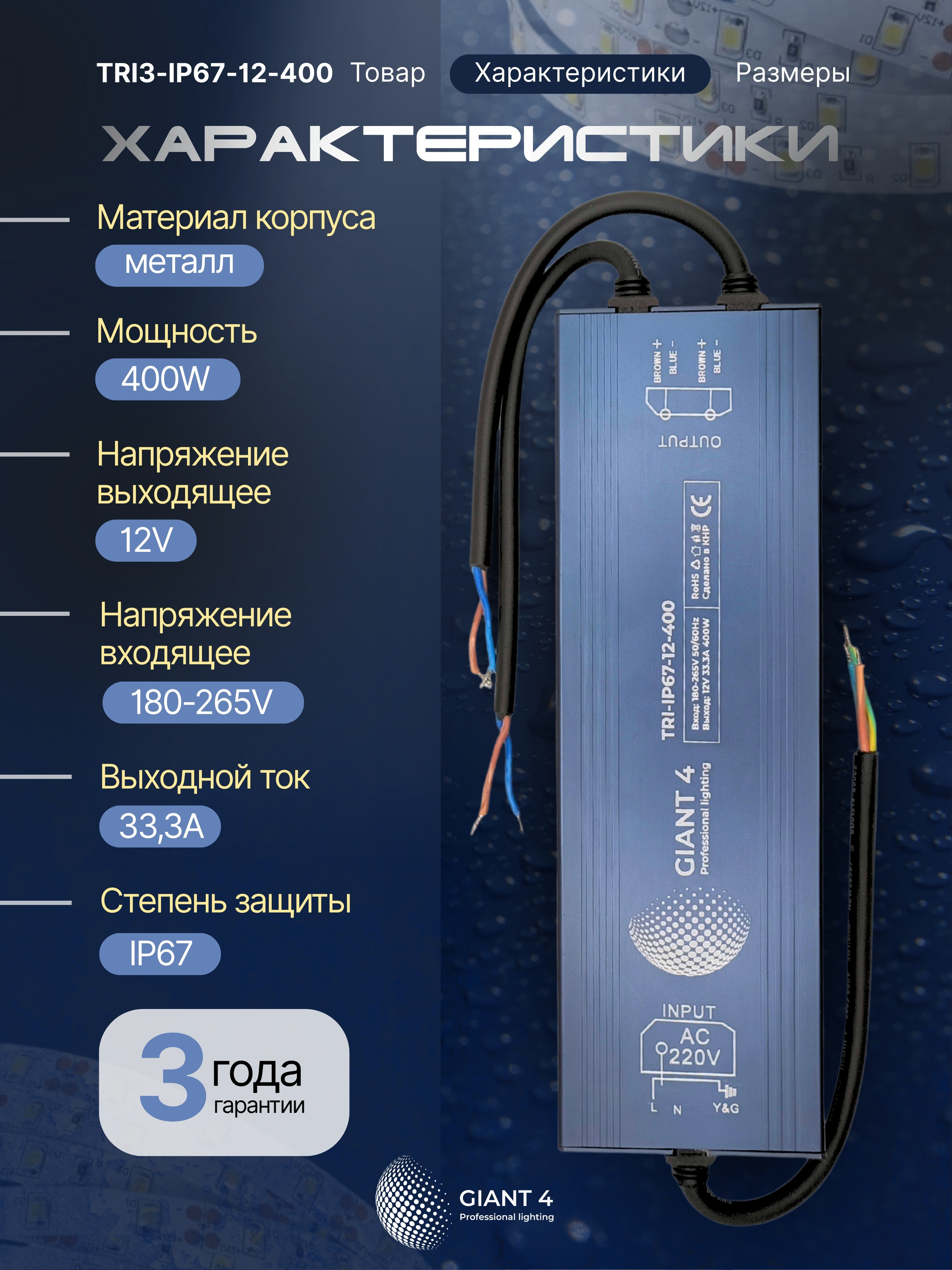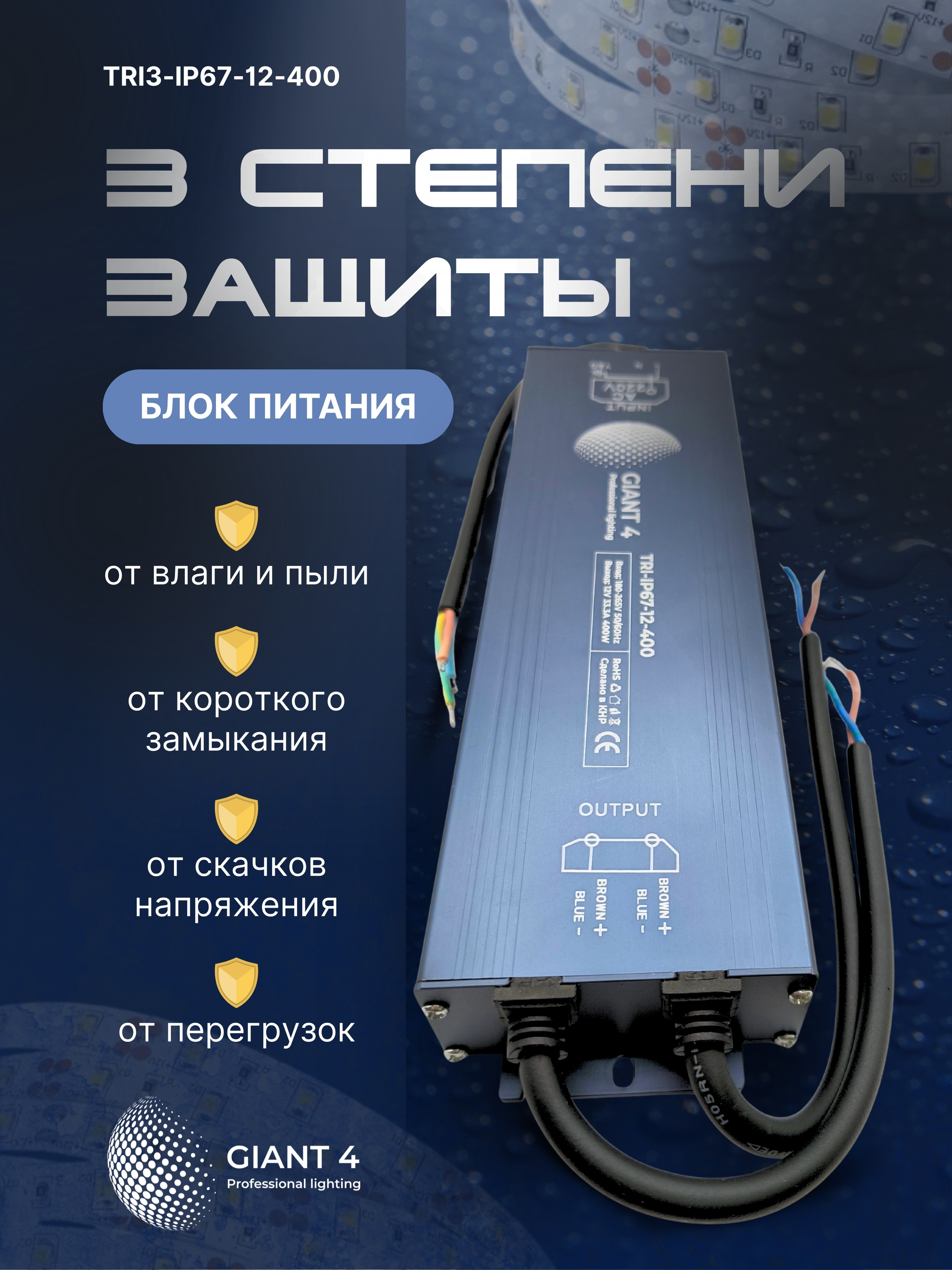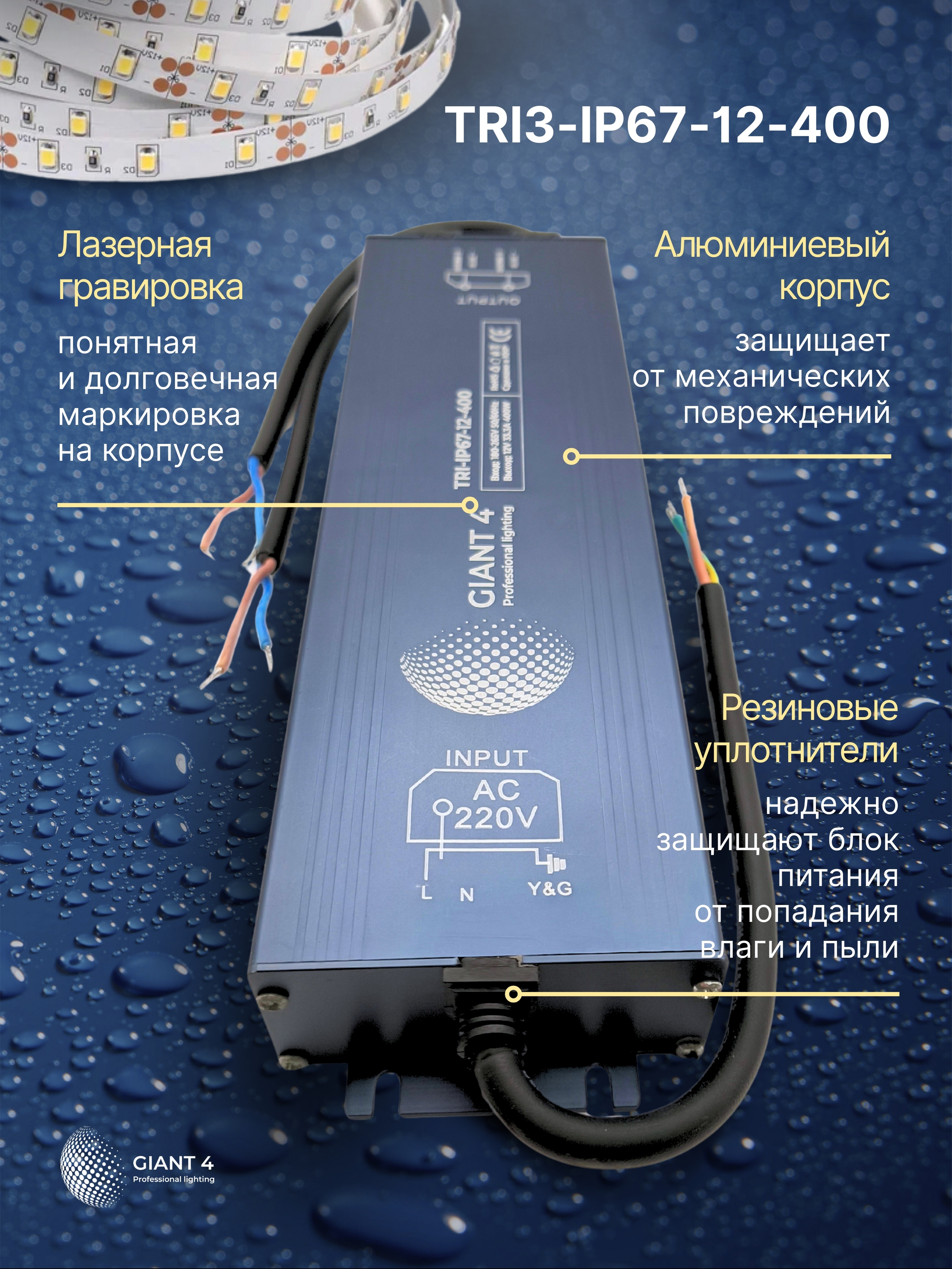 Надежный и мощный блок питания 400Вт напряжением 12В, со степенью защиты IP67. Предназначен подключения светодиодной ленты в суровых условиях: на улице, в уличных вывесках и инсталляциях. Благодаря своей исключительной надежности используется и в сухих помещениях. Особенно это актуально для проектов, где замена блока питания может быть проблемой (например, под натяжным или гипсокартоновым потолком). Т.к. для замены в случае поломки придется снимать весь потолок.