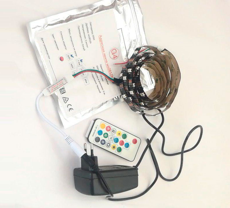 Комплект ленты "бегущий огонь" 30led/метр с пультом SP104e и с блоком питания. Адресная лента WS2812b 30 диодов/метр - самый экономичный вариант и с точки зрения энергопотребления и с точки зрения цены. На 1 метр такой ленты приходится 30 лампочек, т.е. расстояние между диодами составляет 33 миллиметра.