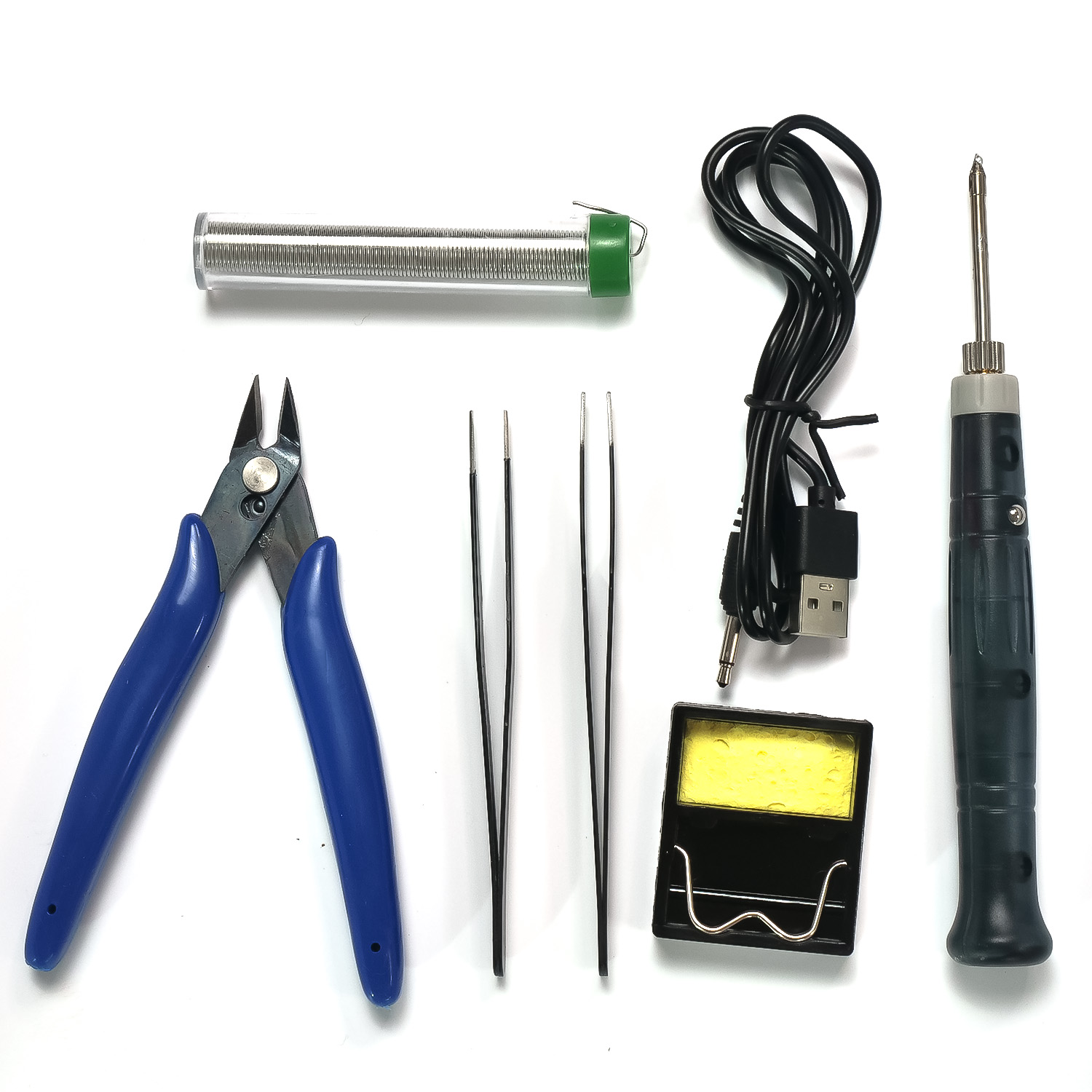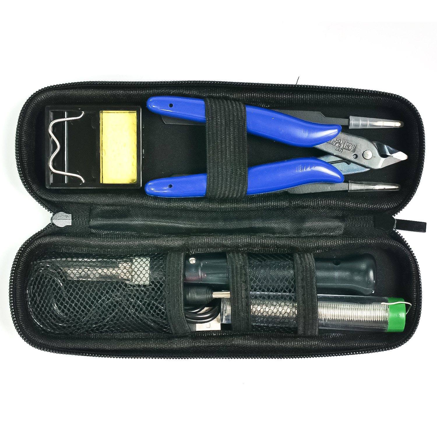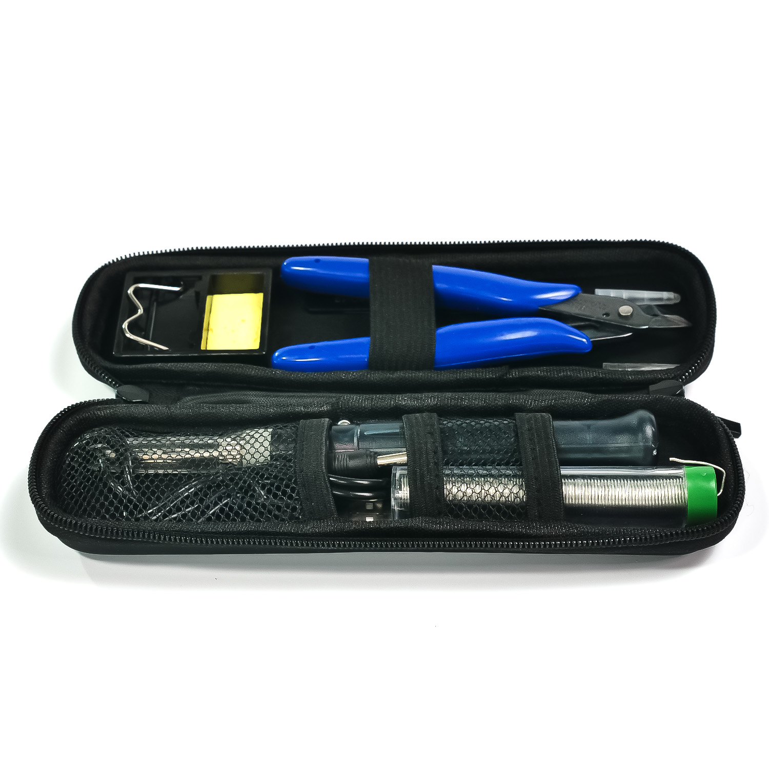7 составляющих, включая паяльник, припой, пинцеты, кусачки и удобный чехол