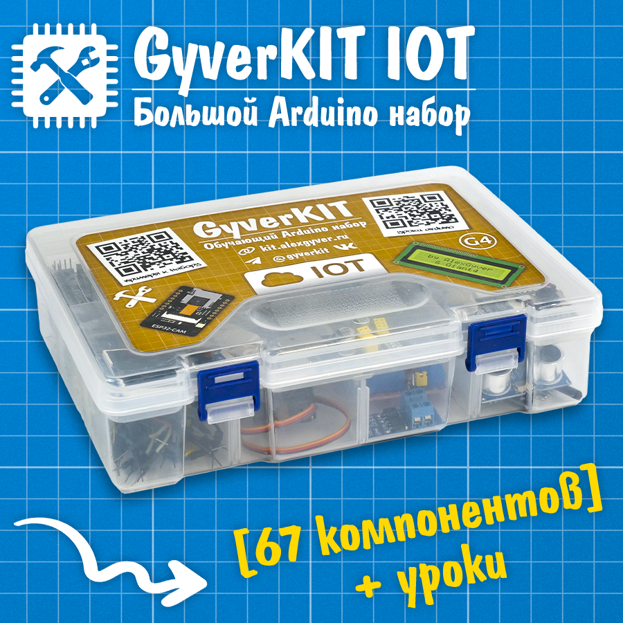 Обучающий комплект микроэлектроники для программирования и создания умного дома от блогера AlexGyver. В набор GyverKIT IOT входит 67 комплектующих, позволяющих реализовать десятки проектов в сфере умного дома и интернета вещей (IOT)!
