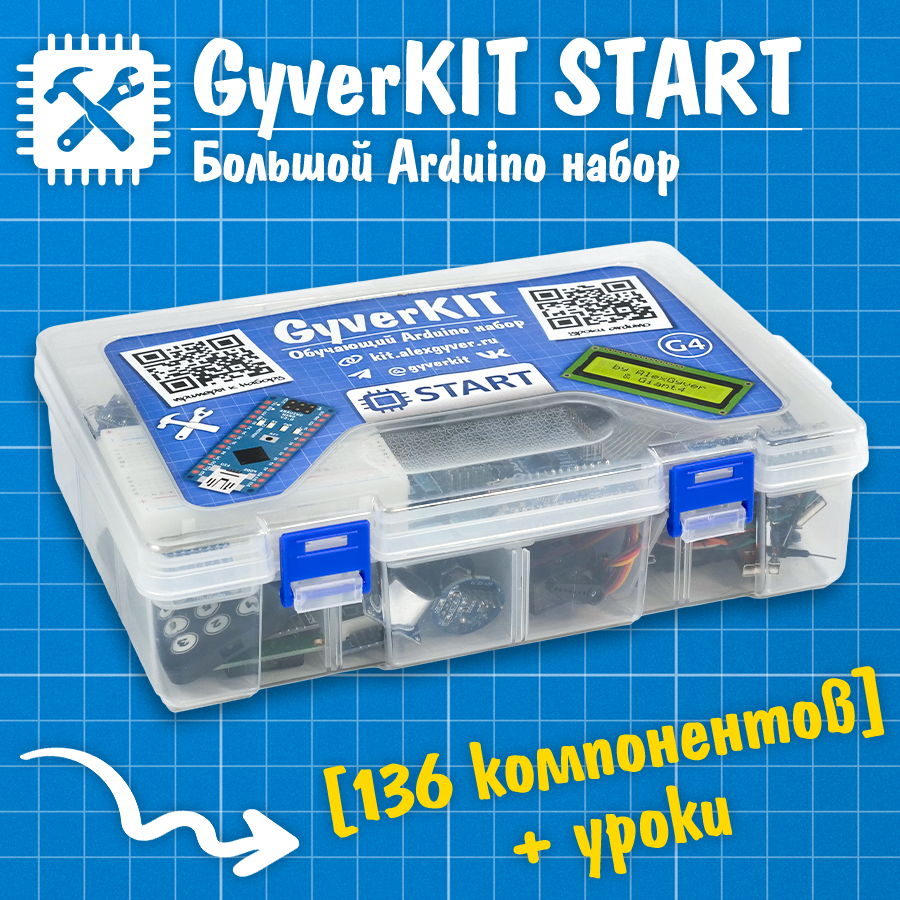 Стартовый набор Arduino Gyver Kit Starter (ранее назывался Mini) от AlexGyver. Включает в себя 136 компонентов, в нем есть все необходимое для начала обучения Ардуино и создания базовых простых проектов.