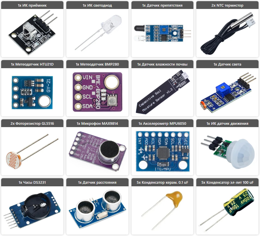 Вы можете найти безымянные наборы ардуино на алиэкспресс, которые стоят в разы дешевле нашего. Однако прежде, чем купить такой набор, проверьте состав. Обычно составлены они без всякой системы и логики и, зачастую, включают в себя только резисторы, провода, коннекторы, то есть набор бесполезной самой по себе мелочевки, к которой необходимы микроконтроллеры, датчики и модули. Этих комплектующих, то есть самой дорогой и важной части, в наборе с алиэкспресс либо не будет совсем, либо будут только самые простые. Качество и безопасность модулей из такого набора с aliexpress тоже оставляет желать лучшего. Кроме того, у вас не будет инструкций и схем на русском языке.
