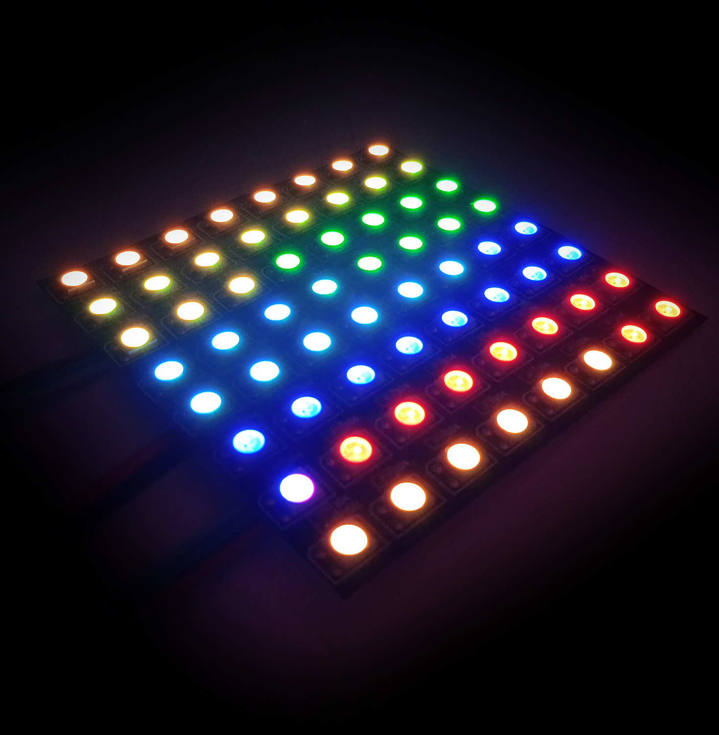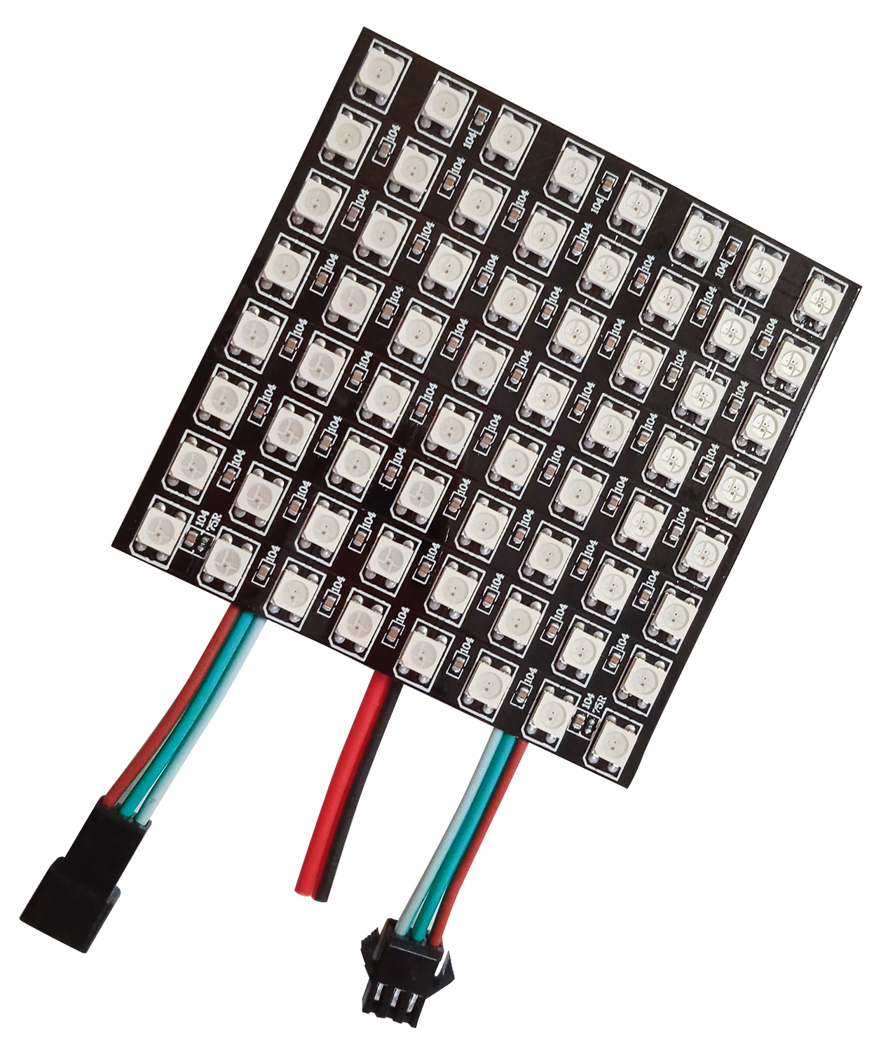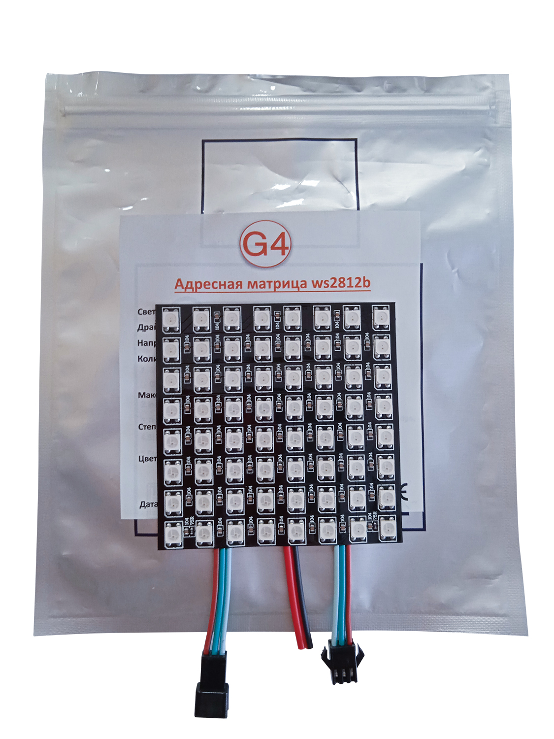 Матрица с адресными диодами ws2812b 64 led 80x80мм. Представляет собой квадрат 8 на 8 диодов размером 80 на 80 мм. Адресные матрицы используют чтобы создавать различные яркие световые эффекты, инсталляции, эквалайзеры, бегущие строки и т.д. Матрицы можно легко разрезать и соединять в цепь в соответствии с указателями. В качестве подложки используется алюминий, позволяющий сгибать ее под углом до 90 градусов, сохраняя работоспособность.