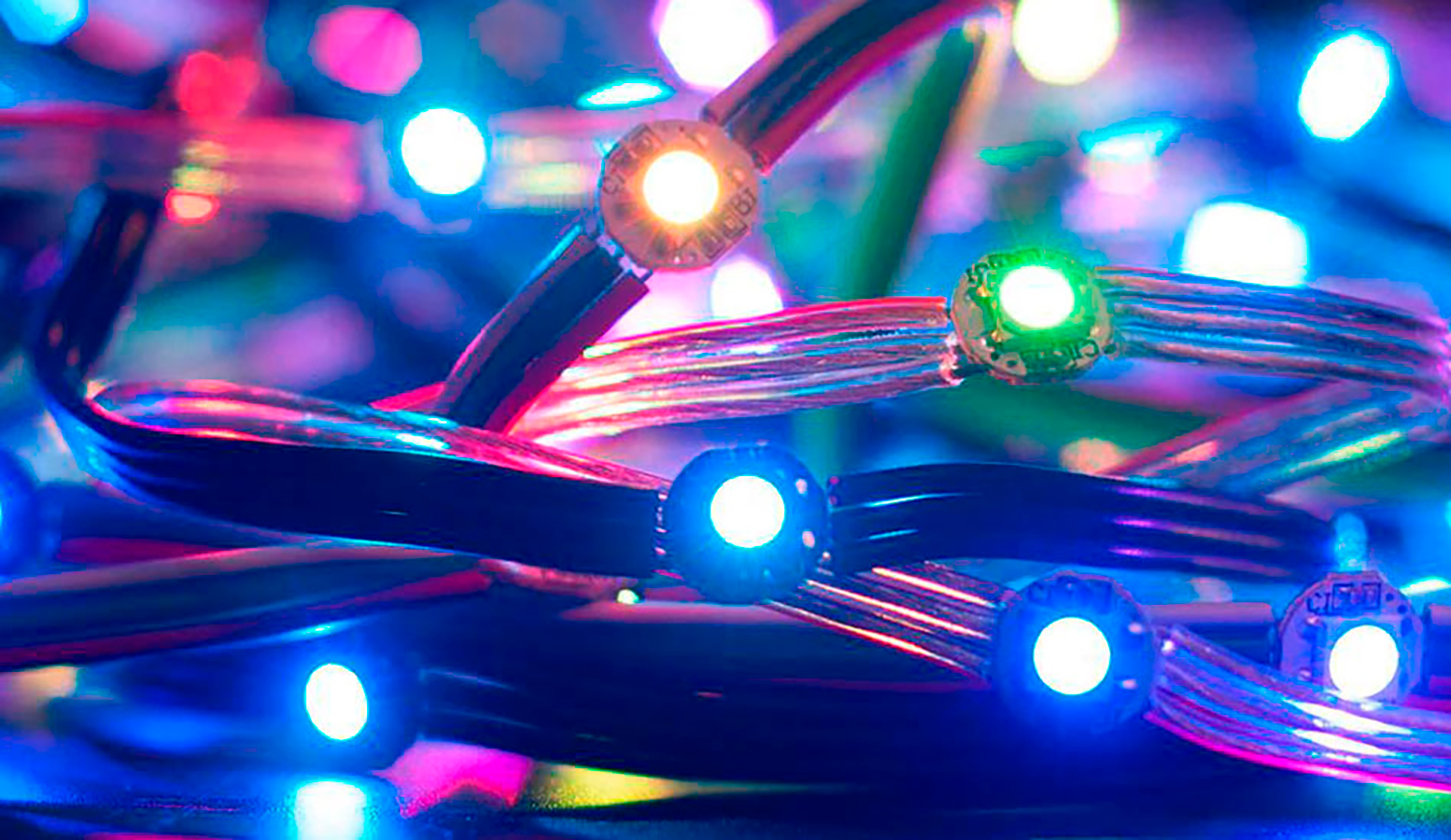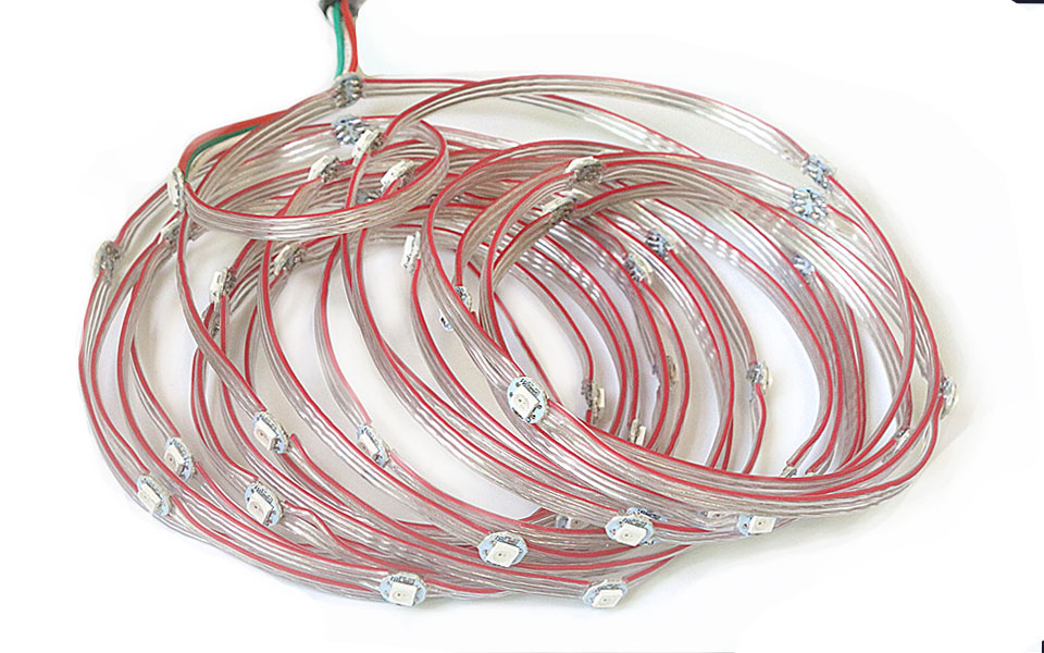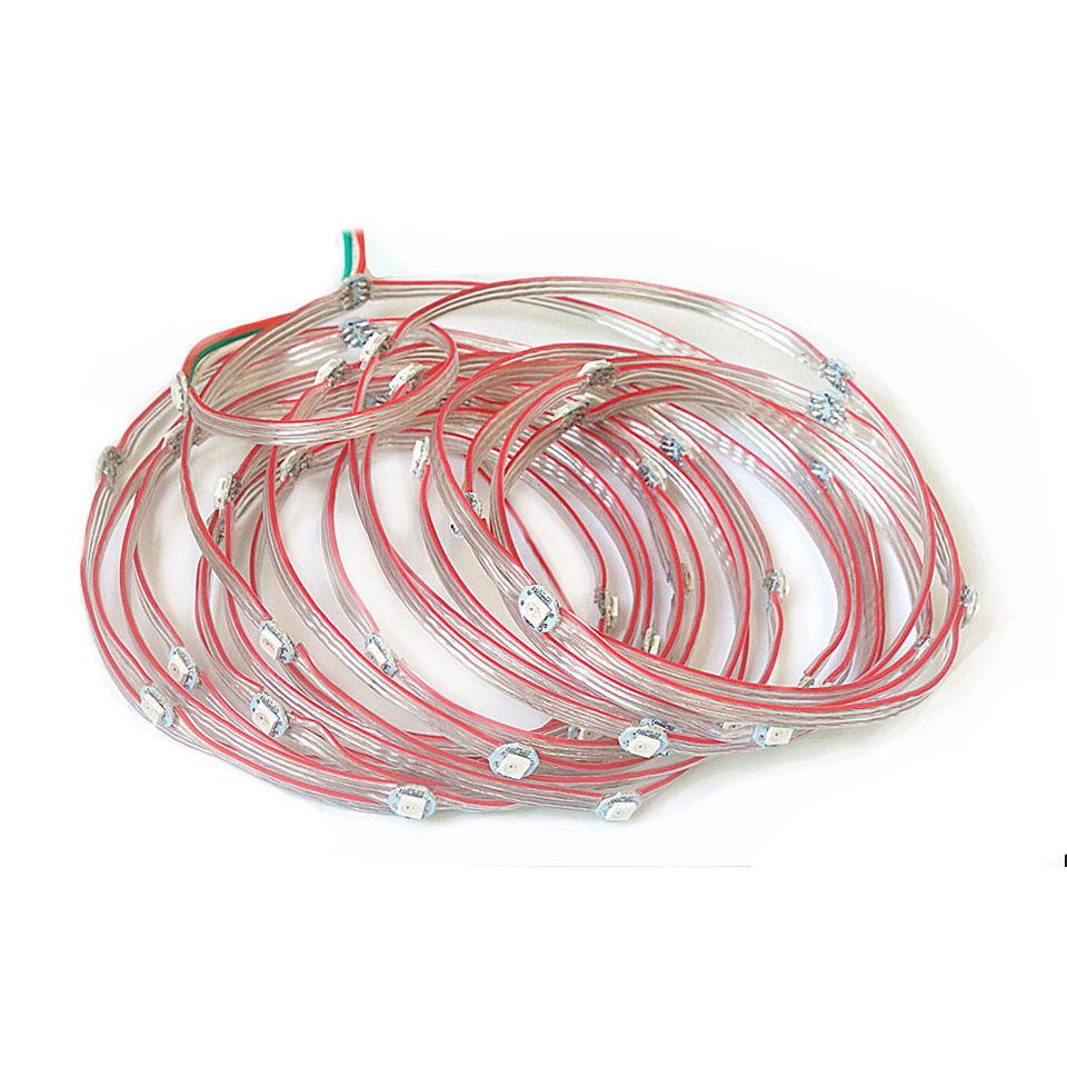 Адресная гирлянда ws2812b 50 led - это 50 адресных светодиодов с чипом ws2812b, припаянных к проводу длиной 5 метров. По сравнению с адресной лентой обладает большей гибкостью, позволяющей сделать такие проекты как умная гирлянда Гайвера на елку или, например цифровая сетка на окно. Следует учитывать, что ее яркость не сравнится в обычной адресной лентой из-за низкой плотности расположения диодов (в среднем - 8,3 диода на метр), однако она значительно ярче обычной новогодней гирлянды.