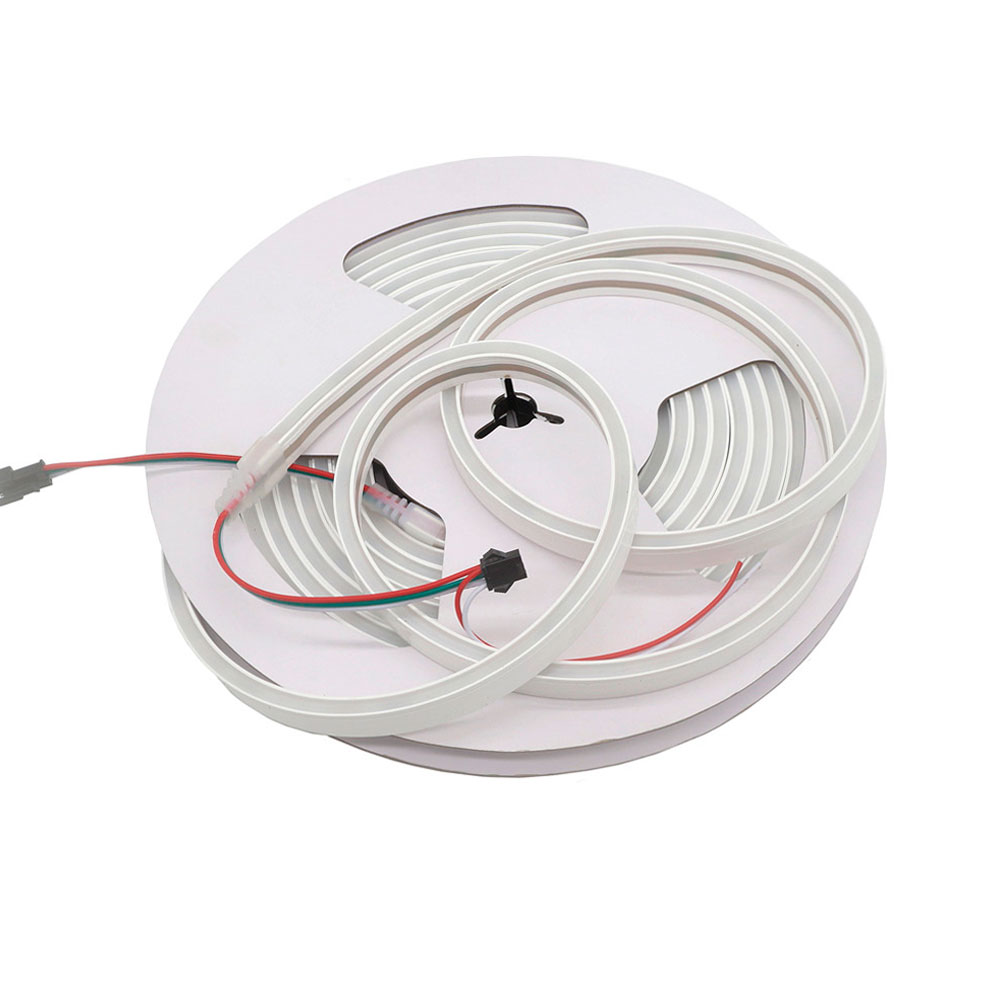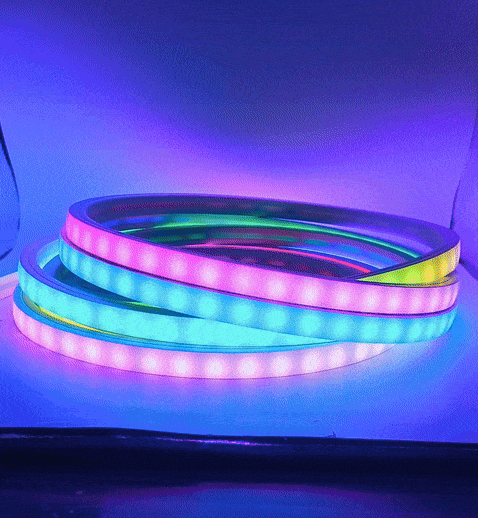 Адресный светодиодный неон представляет собой адресную ленту WS2811 в специальной силиконовой оболочке. Светодиодная лента внутри может программироваться и управляться через пульт, приложение на смартфоне или компьютере (но для этого нужен контроллер). На каждом метре адресного неона установлено 20 управляющих чипов WS2811 (по 1 штуке на 3 диода), что позволяет создавать анимации в стиле "бегущий огонь", "эквалайзер" и многие другие. Кроме того это первая в нашем магазине адресная лента 24В! Это позволяет применять ее в некоторых специальных проектах и более удобно доставлять питание от блока питания до адресного неона.
