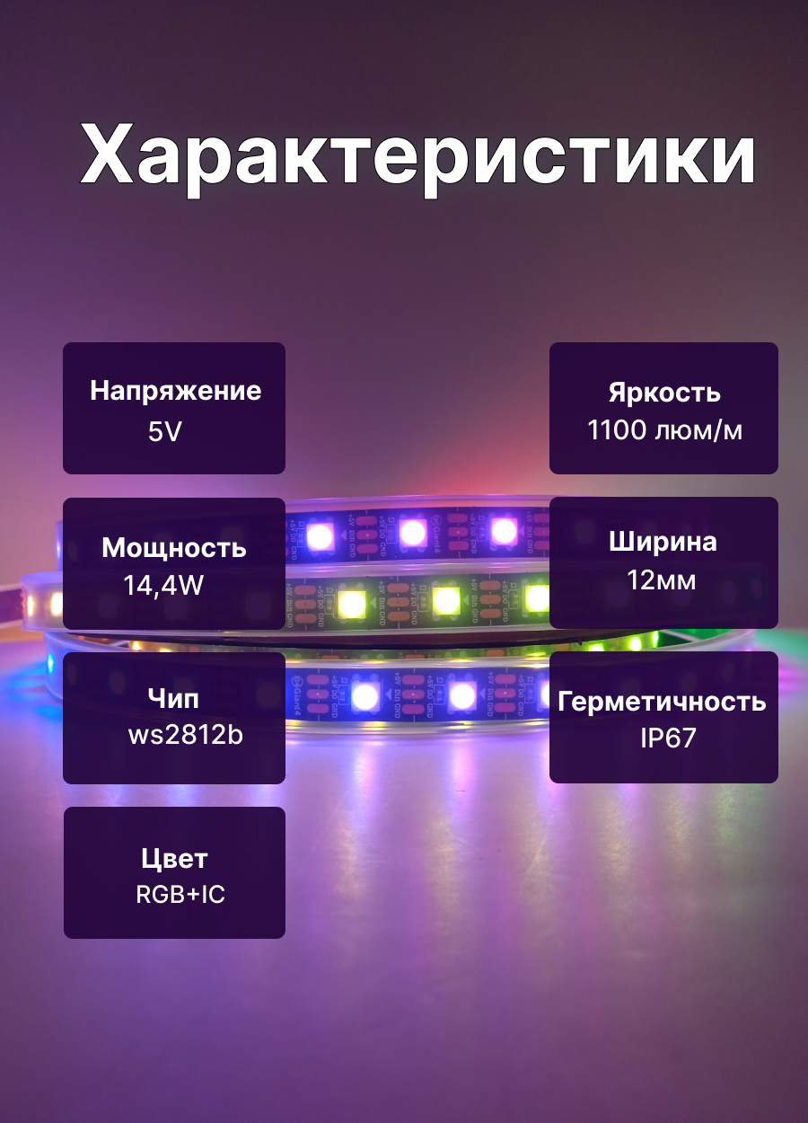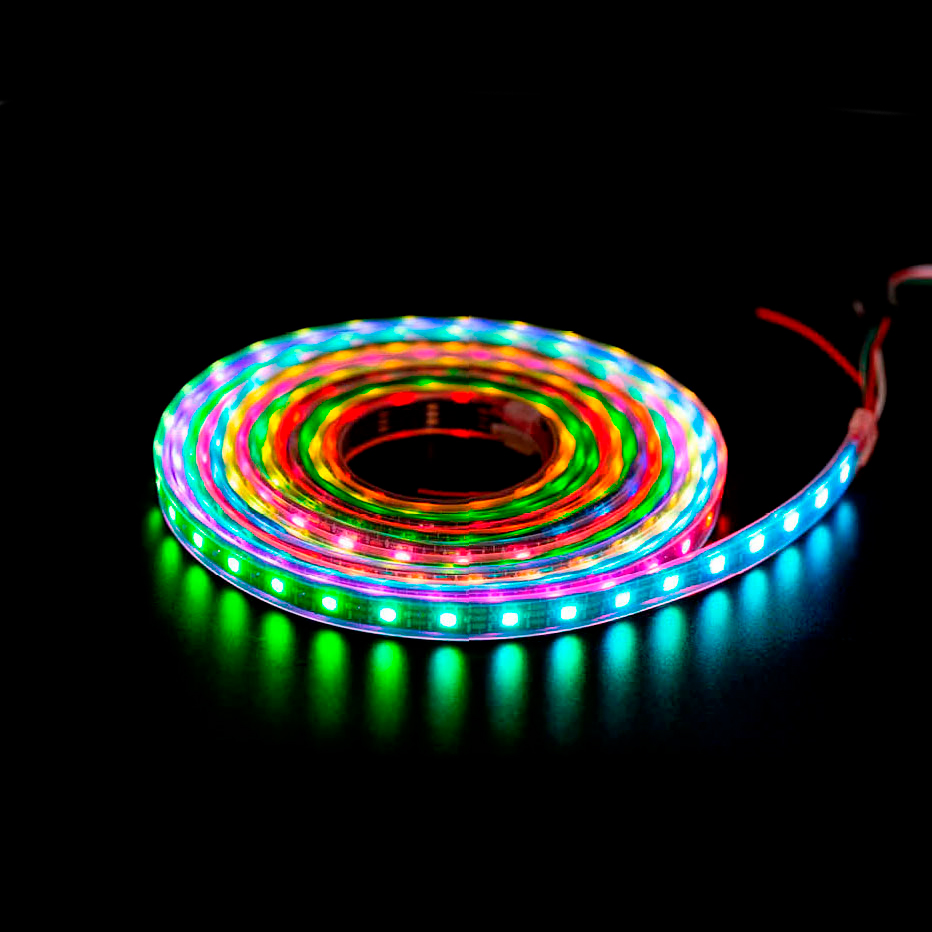 Управляемая лента ws2812b ip68 60 led - достаточно универсальный вид адресной ленты. Она подходит для украшения фасадов зданий, уличных LED видеоэкранов, динамической подсветки во влажных помещениях, а также может использоваться под водой. Степень защиты ip68 означает, что лента имеет защитный кожух, который внутри полностью залит силиконом под давлением. Это максимально возможная степень защиты для светодиодной ленты на данный момент. На каждом метре этой ленты располагаются 60 диодов, суммарной мощностью 14.4 ватт.