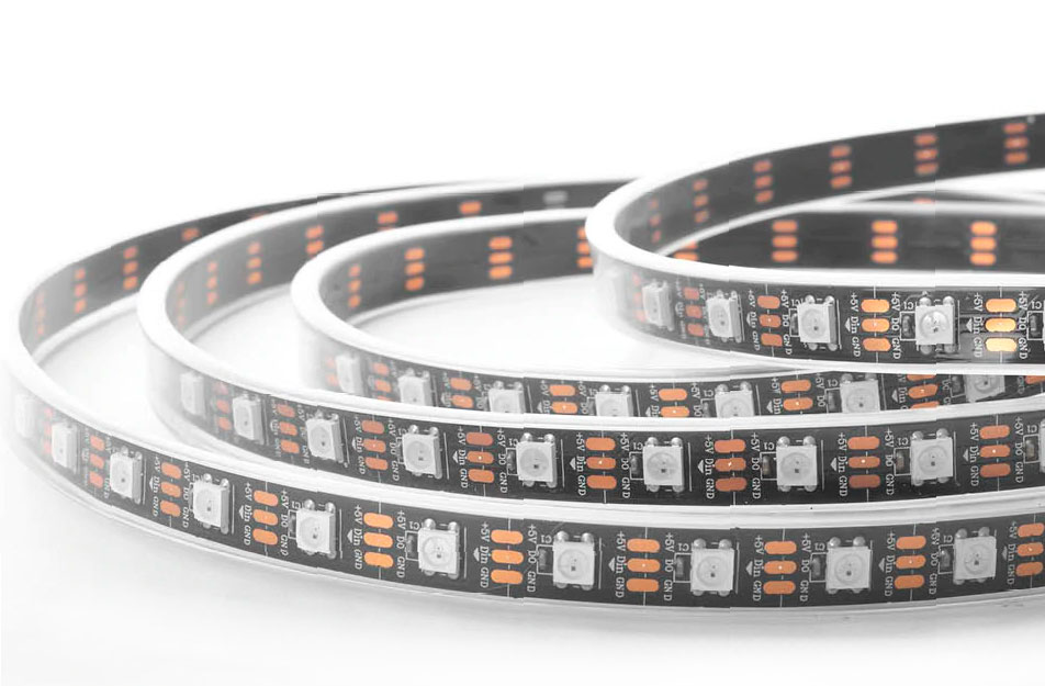 Следует обратить внимание на то, что для работы адресной ленты потребуется блок питания 5v достаточной мощности и контроллер. Диодная лента с чипом 2812b - один из самых современных и востребованных видов SPI лент на рынке. Драйвер 2812b гораздо компактнее своих предшественников, поэтому производители помещают его в самом корпусе светодиода. При близком рассмотрении под прозрачным люминофором чип видно невооруженным глазом: это маленький черный прямоугольник с позолоченными проводниками.