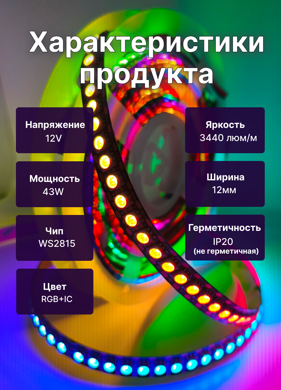 Адресная лента WS2815 144led ip20 - яркая адресная лента, предназначенная для создания анимаций, украшений и даже основного освещения на основе адресных лент. Это одна из самых надежных и мощных адресных лент в нашем магазине. Помимо качественной подложки и диодов производства Cree, у ленты WS2815 144 led имеется дополнительный, резервный канал данных. Благодаря ему, при отключении одного диода по любой причине, дальнейшая линия продолжит работать.