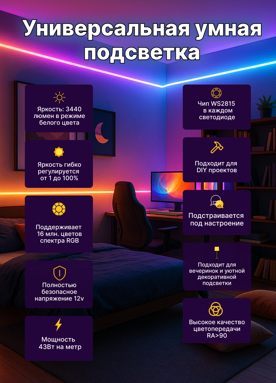 - Адресная лента 5050 ws2815 144led ip20 не защищена от влаги и пыли. Ее можно использовать только внутри сухих помещений.