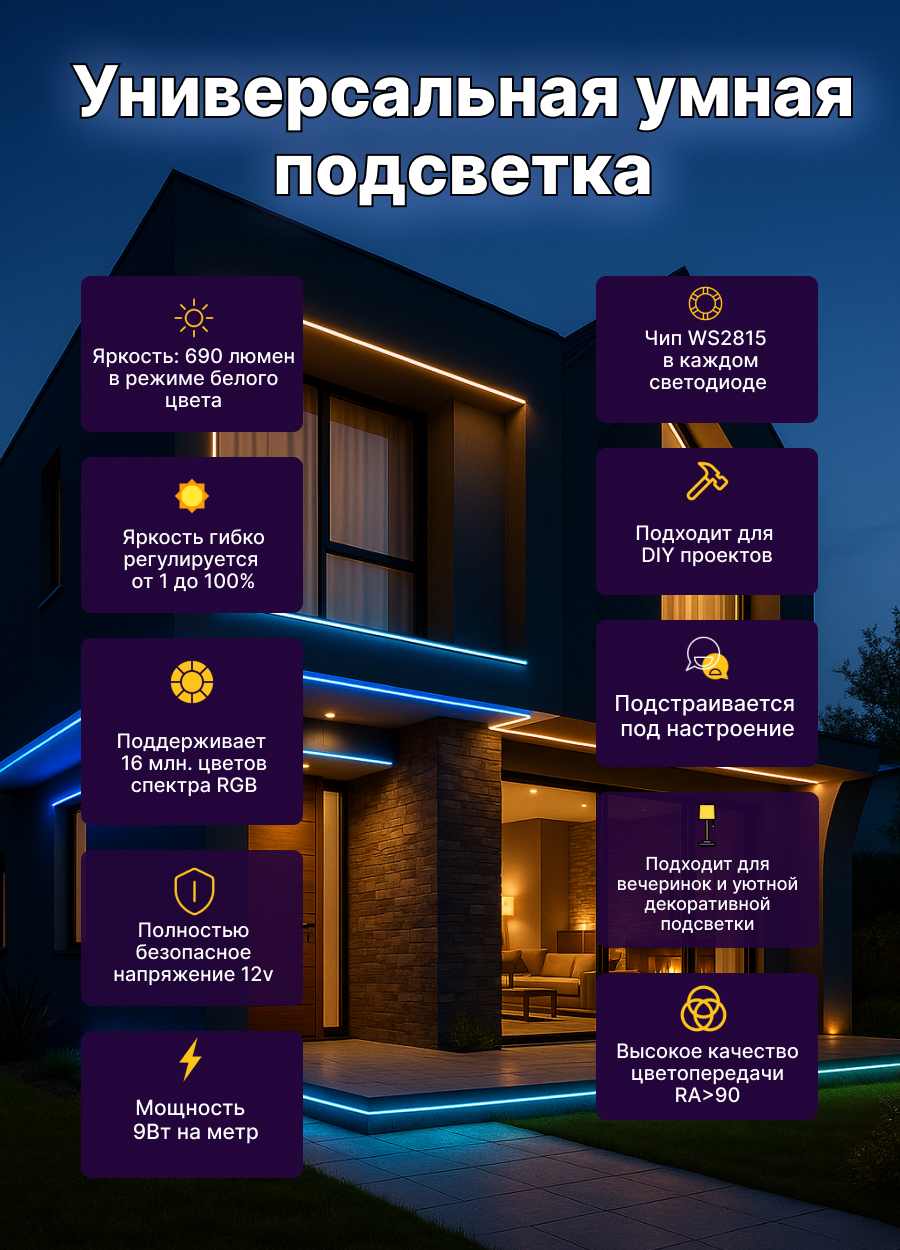 - Это низковольтная лента напряжением 12 вольт. Это значит, что она не может ударить током человека. Ее можно трогать во включенном состоянии.