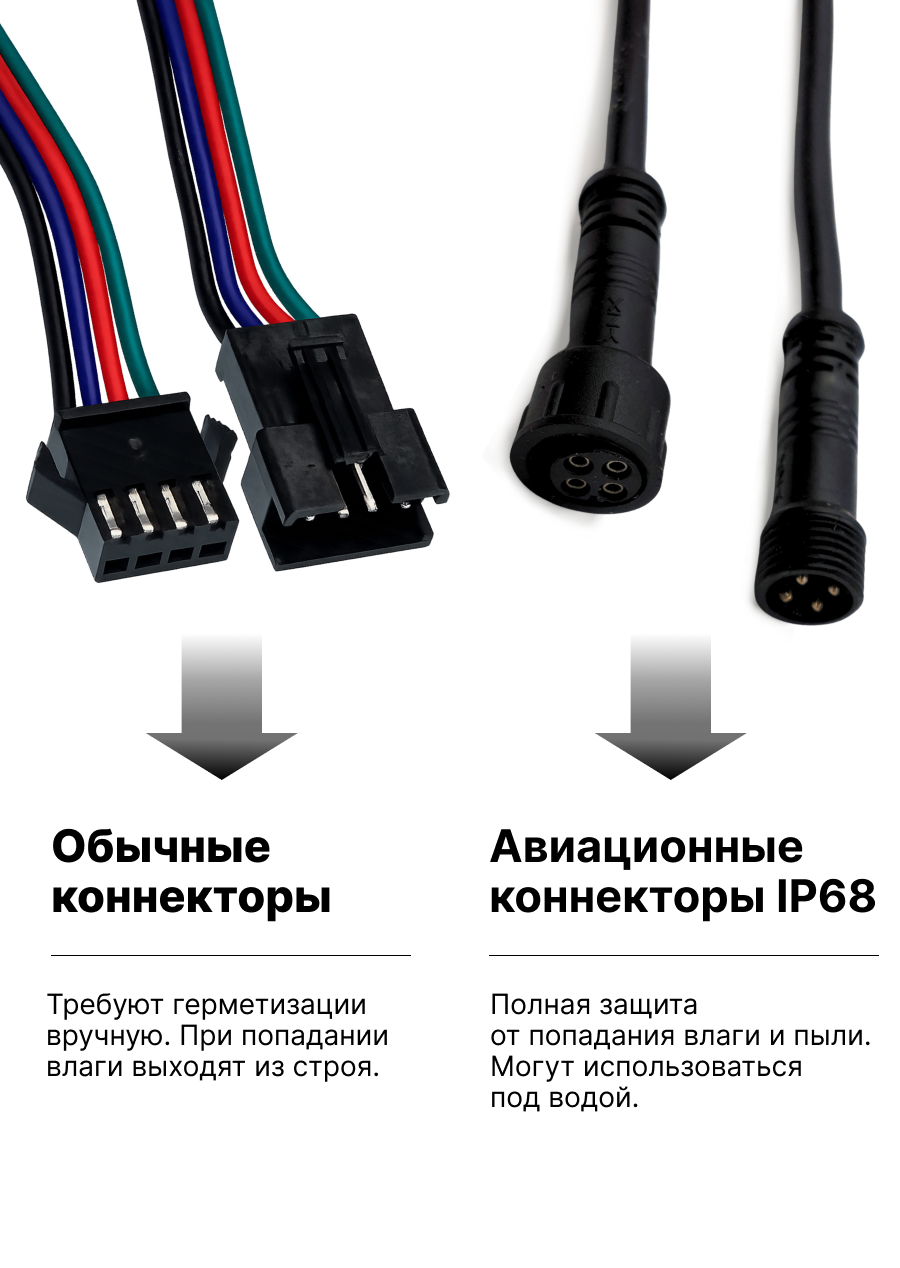 - Лента оснащена профессиональными авиационными коннекторами с резьбовым соединением. Они вкручиваются друг в друга и обеспечивают полную герметичность. В отличие от обычных пластиковых коннекторов, соединение защищено от попадания влаги и может использоваться под водой.