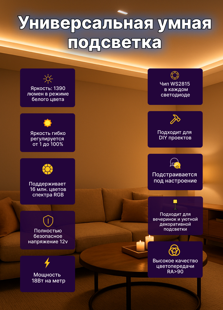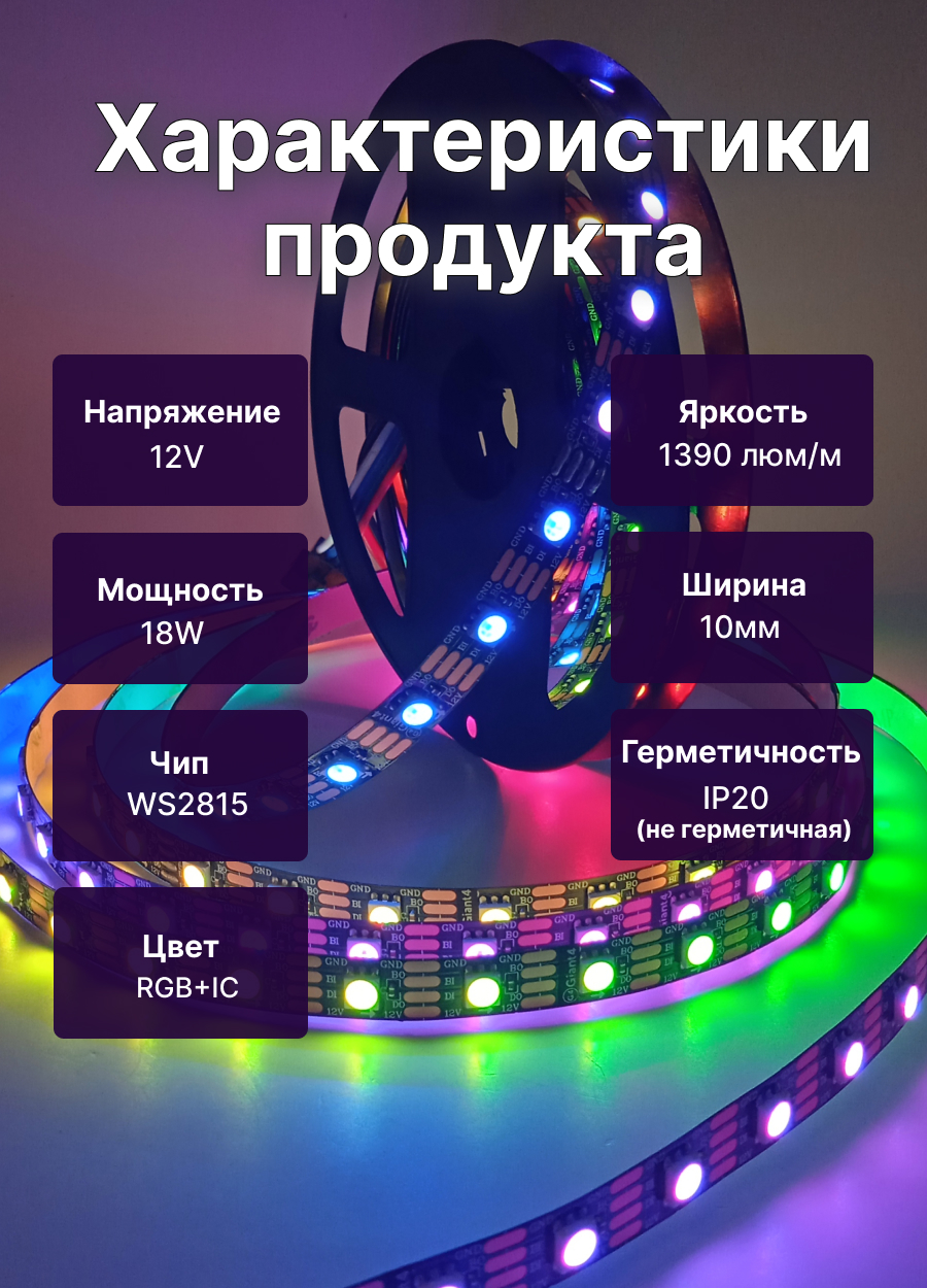 - Адресная лента 5050 ws2815 12V 60led не защищена от влаги и предназначена для использования внутри сухих отапливаемых помещений.