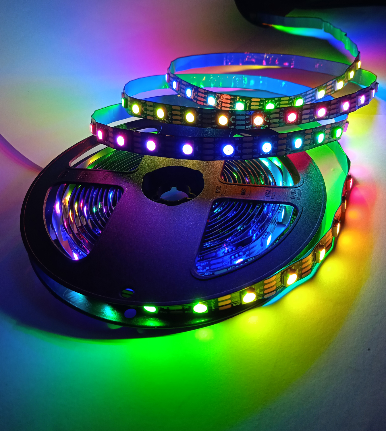 Важным плюсом адресной ленты ws2815 по сравнению с ними является ее более высокое напряжение 12v против 5v. На практике это дает более удобное подключение (можно тянуть провода дальше и подключать больше ленты в одну линию), а также - экономию на блоках питания (блоки с напряжением 12v заметно дешевле, чем их аналоги на 5v).
