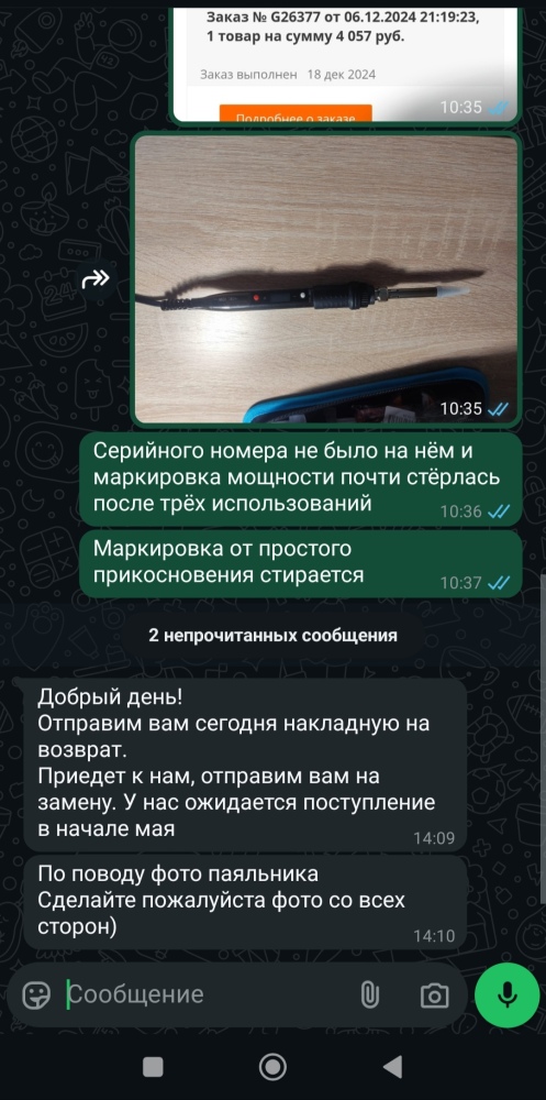 По приведенным Вами аргументам - проведем детальный разбор ситуации, примем меры, а также обновим ответ на Ваш отзыв. Так же хотим принести извинения за долгое ожидание Вашего заказа. Задержки с поставками грузов связаны с межгосударственными отношениями России, Казахстана и других стран, вызвавшими коллапс на таможне, начавшийся в сентябре. В результате ужесточения проверок, проверок каждой машины, скорость прохождения границы практически равнялась нулю. Из-за этого на границе образовалась пробка из нескольких тысяч фур, месяцами ожидавших прохождения таможни. Государство не выдает никаких официальных подтверждений форс-мажора, перекладывая вину и ответственность на частный бизнес. UPD: Провод по 5м - исправили описание на сайте, у AlexGyver был указан один цвет 5м. Кусачки - в последней партии выявили частичные проблемы дефекта с лезвиями, а также маркировки, исправим к следующей партии. Пинцет - солидарны с вашими замечаниями, проблема будет устранена в следующей партии. Паяльник - с завода он поставляется со случайной базовой настройкой. Его необходимо калибровать по инструкции, которая размещена у AlexGyver. Припой - ранее многие клиенты жаловались на качество старого припоя, поэтому мы сменили завод изготовитель и его качество стало лучше.