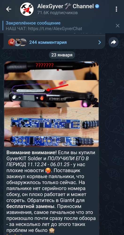 Иван, мы свяжемся с вами завтра для проверки возникшей ситуации, заберем ваш набор обратно и вернем деньги. Мы обязательно проверим все указанные проблемы с товаром и с обслуживанием и примем меры, будьте уверены. По припою - он действительно изменился, т.к. на старый часто жаловались что он не плавился даже при 250 градусах и выше. Этот плавится намного лучше, значит паять им должно быть удобнее, мы проверяли. По калибровке - это извечная проблема паяльников JCD, такого чтобы они с завода шли откалиброванными, практически не бывает. Поэтому, возможно, в будущих партиях GyverKIT Solder Будет использован другой паяльник. Приносим глубочайшие извинения за то, что вам не понравился наш товар. Это оригинальный Solder, никаких других "оригинальнее" не существует, нам также передал вашу жалобу Alex Gyver. Не переживайте, завтра же мы во всем разберемся!